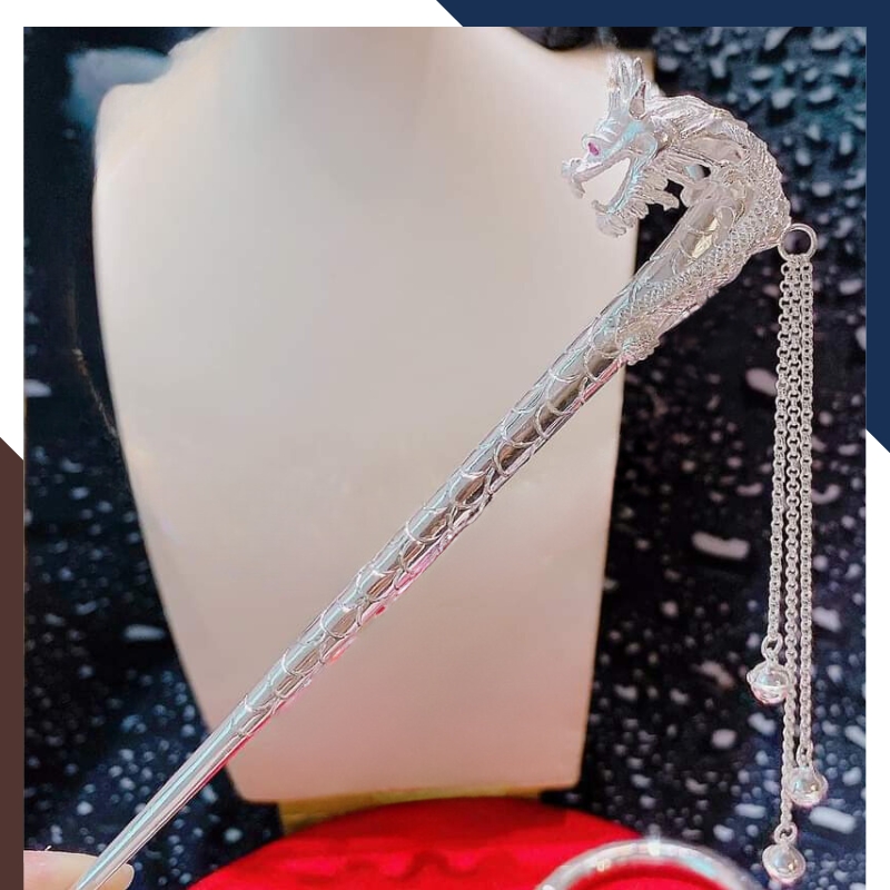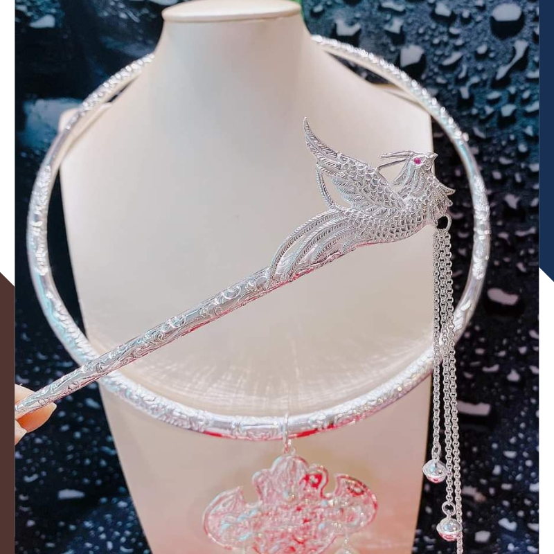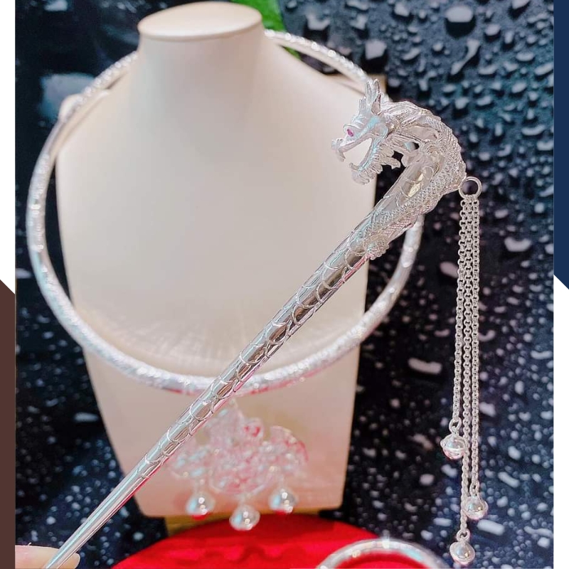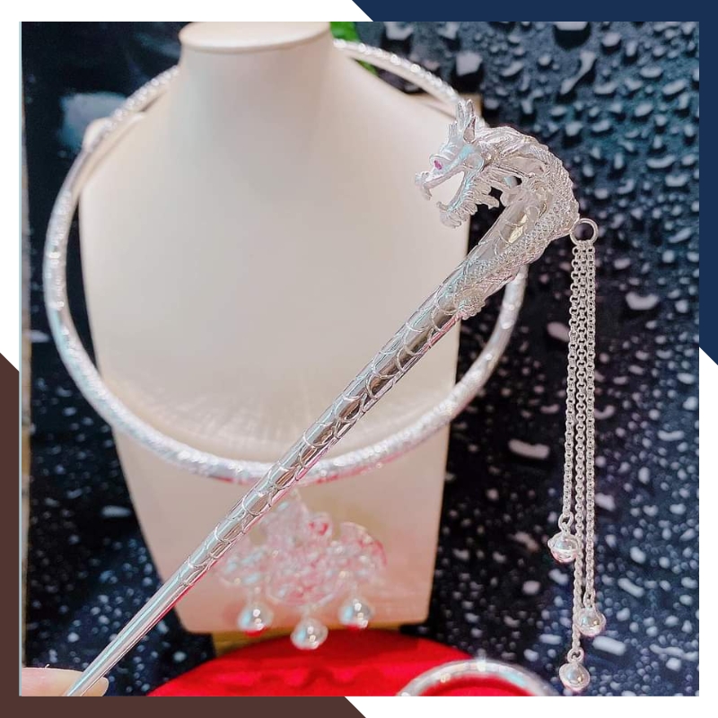 Sản phẩm " Bộ trang sức hầu đồng gồm Kiềng cổ, kiềng tay, trâm cài tóc, bông tai và khánh bằng bạc ta nguyên chất chạm rồng phượng mã 46C5762 ", được làm từ 4 cây 6 chỉ bạc ta nguyên chất S99 với đặc tính không gây kích ứng cho da, đảm bảo độ bền và sáng bóng theo thời gian. Điểm nhấn đặc biệt của bộ trang sức hầu đồng này có 5 món gồm kiềng cổ, kiềng tay, trâm cài tóc, bông tai được thiết kế chạm khắc rồng, phượng sắc nét và tinh xảo được nhiều phụ nữ ưa chuộng và lựa chọn khi kết hợp với áo dài, các bộ trang phục dân tộc, dùng cho các dịp lễ hội, biểu diễn, quay phim, chụp ảnh, các buổi hầu đồng..., không chỉ toát lên vẻ đẹp tinh tế, sang trọng cho người đeo mà còn tạo nên sự hài hòa và tôn lên vẻ đẹp truyền thống của áo dài.