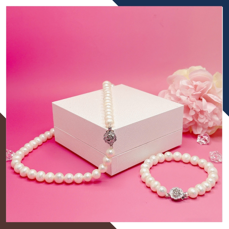 Bộ sản phẩm gồm: Vòng cổ, vòng tay và hộp đựng ngọc trai chuyên dụng