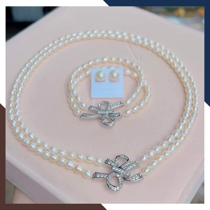 Bộ trang sức ngọc trai gạo 2 vòng dáng choker khóa nơ mặc áo dài cho nữ trẻ trung mã 78K70T220