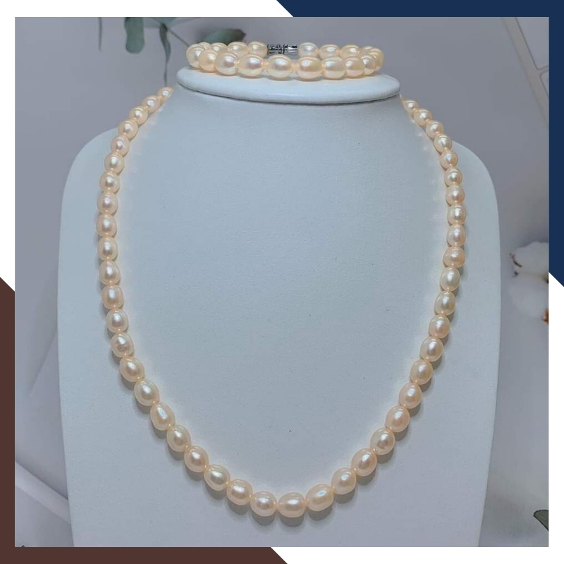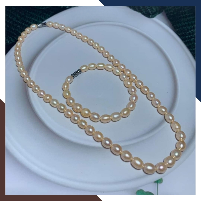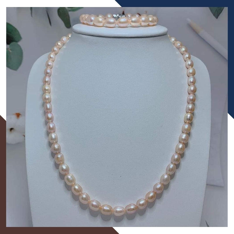 Sử dụng ngọc trai thật nuôi nước ngọt tự nhiên size 7mm - 8mm hình hạt gạo ( oval ), xà cừ dày, độ bóng 4A, ít vết sinh trưởng