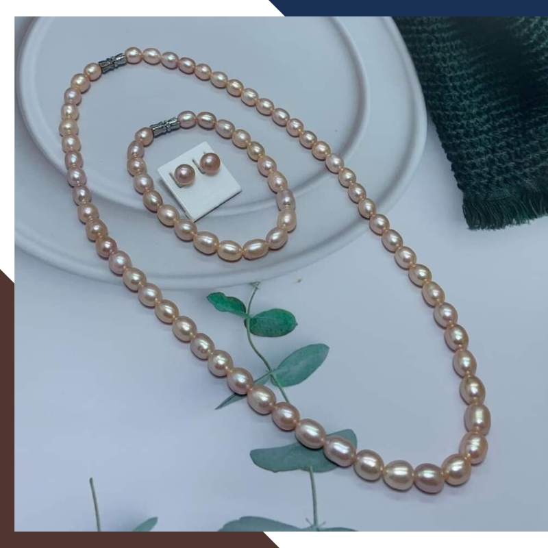 Bộ vòng ngọc trai gạo màu hồng tím mã BTSNT03 gồm vòng cổ chokẻ, vòng tay và bông tai - được làm từ chuỗi ngọc trai thật nuôi nước ngọt 7-8mm có bề mặt bóng đẹp tự nhiên, đã trở thành một biểu tượng của sự quý phái và thanh lịch. Có 2 màu ngọc trai để khách hàng lựa chọn là bộ ngọc trai hồng và bộ ngọc trai tím.