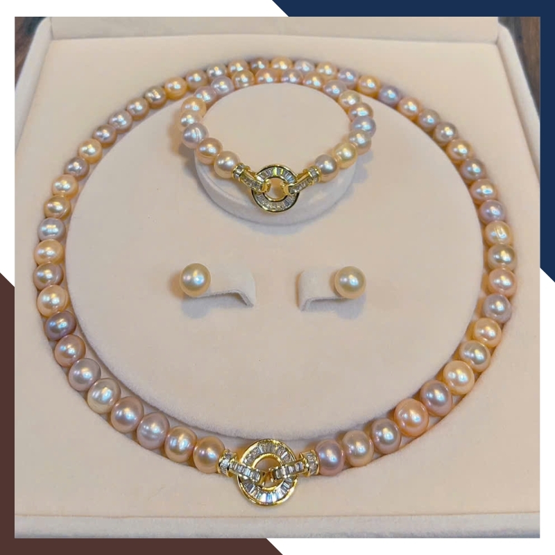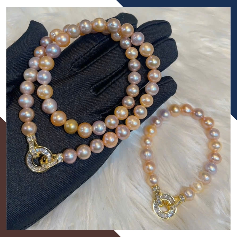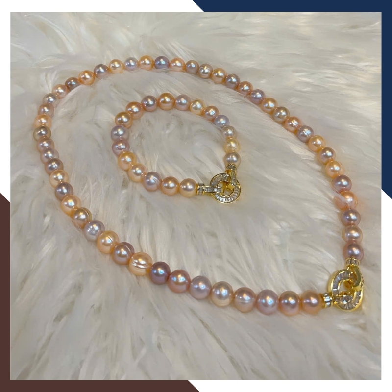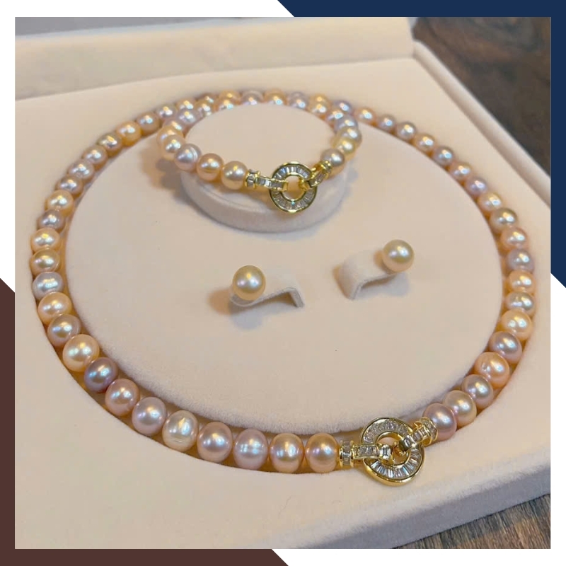 Bộ trang sức ngọc trai thật hạt to 9–10mm mix tím & hồng cam được xem là món phụ kiện lý tưởng cho phụ nữ từ 28–55 tuổi: