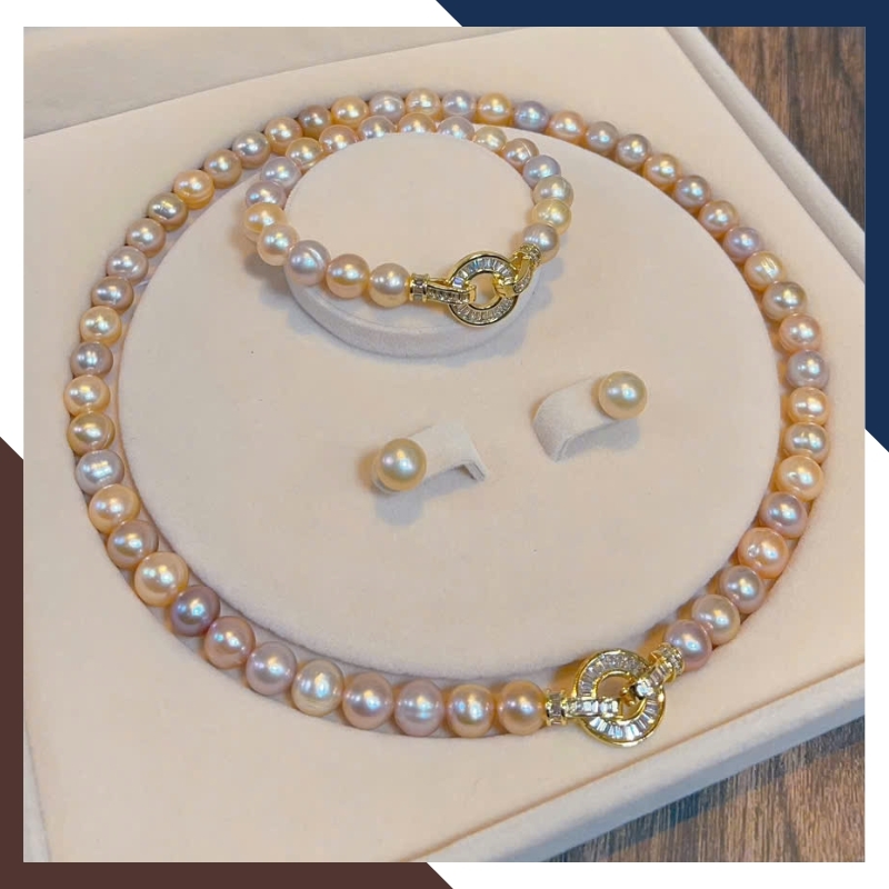 → Ngọc trai có kích thước 9–10mm, được chọn lọc kỹ để đảm bảo độ tròn, bóng và đồng đều giữa các hạt. -