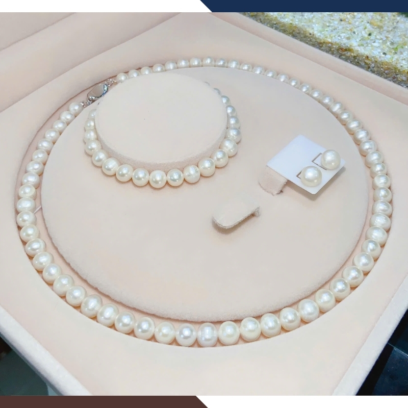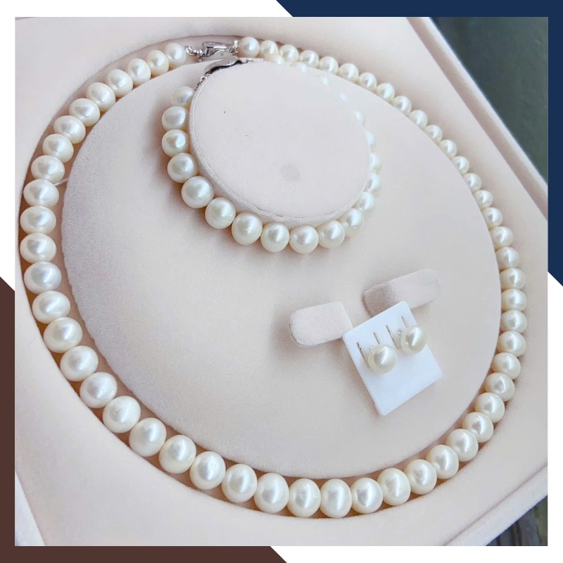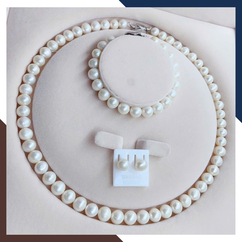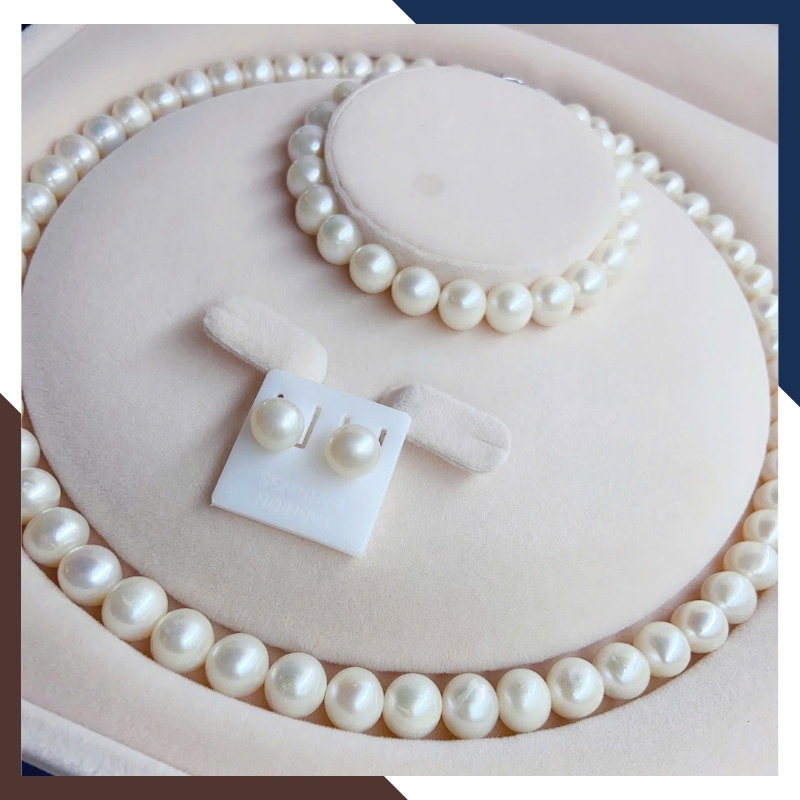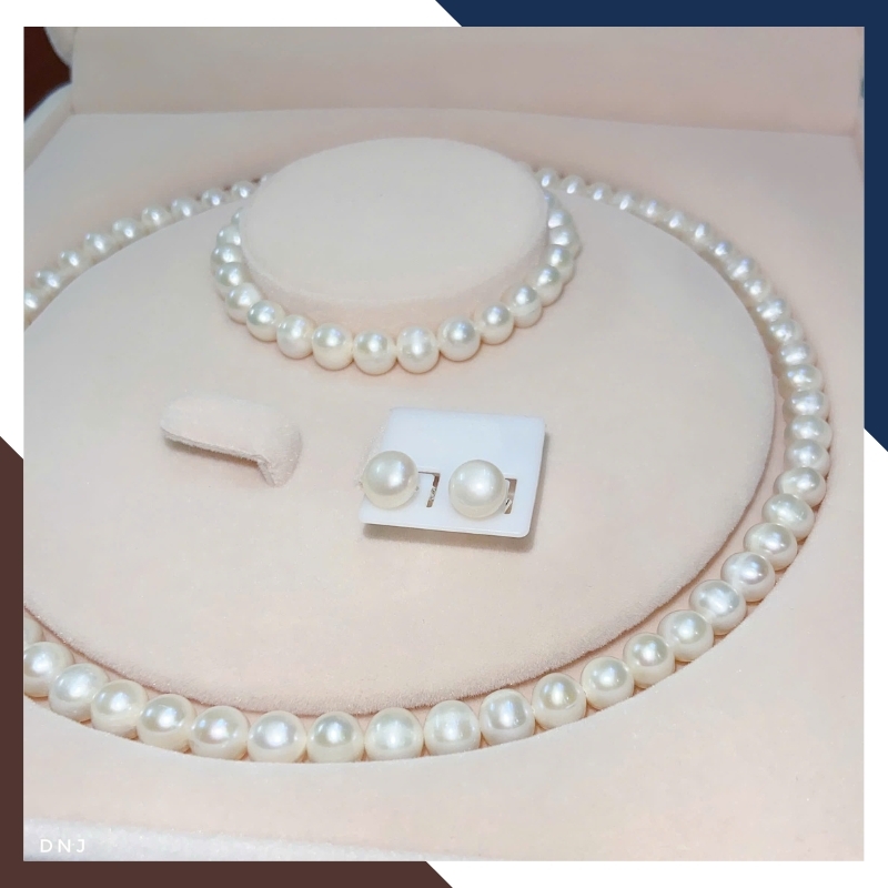 Bộ sản phẩm gồm: Vòng cổ ngọc trai, Vòng tay ngọc trai, Bông tai ngọc trai và Hộp đựng ngọc trai chuyên dụng.