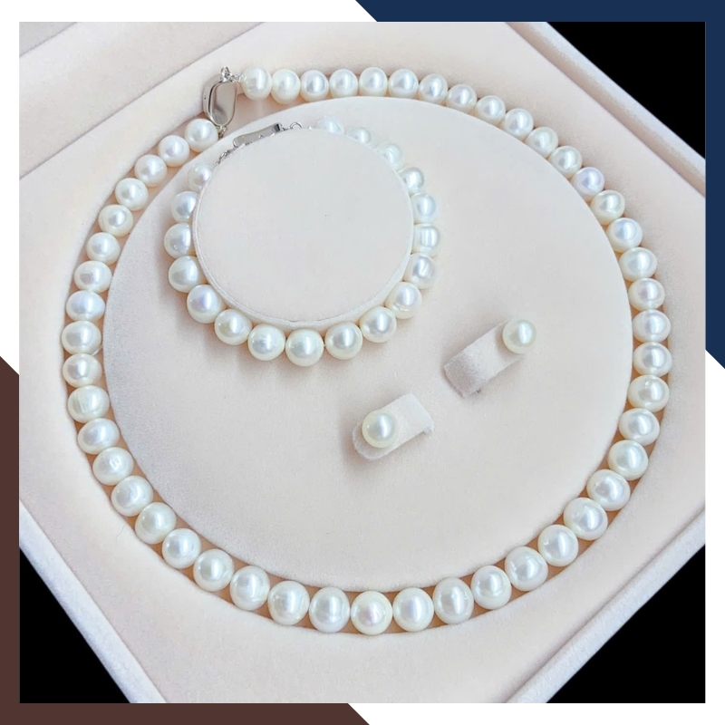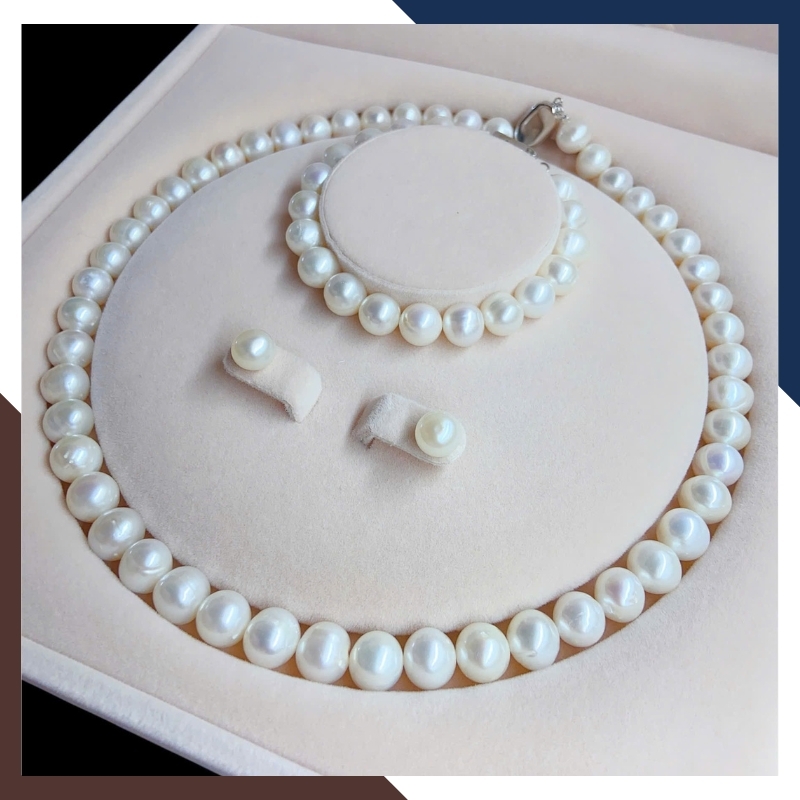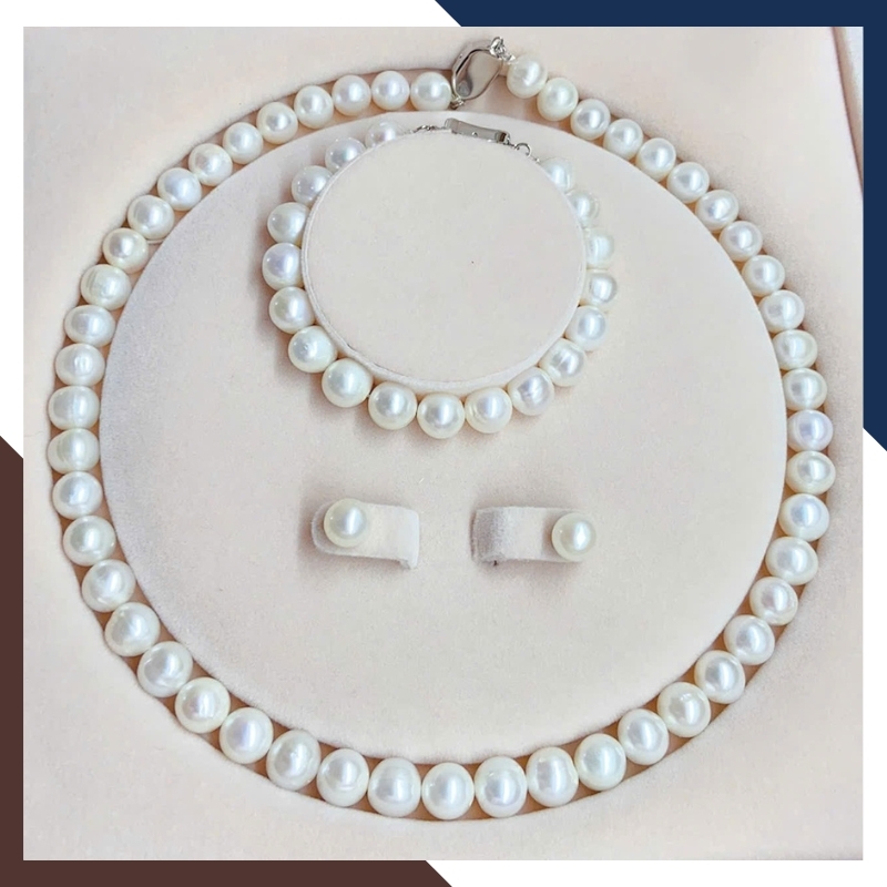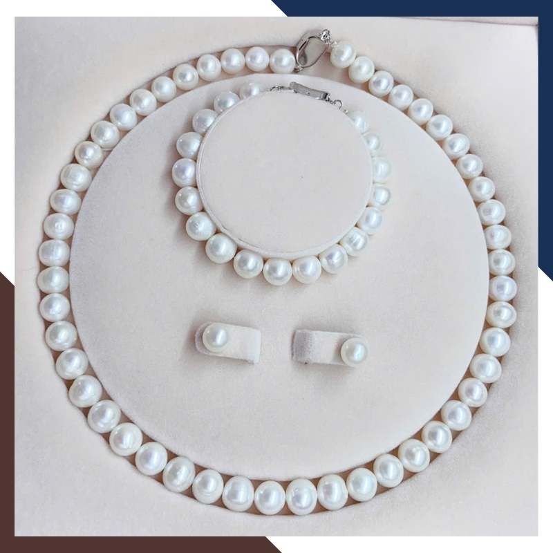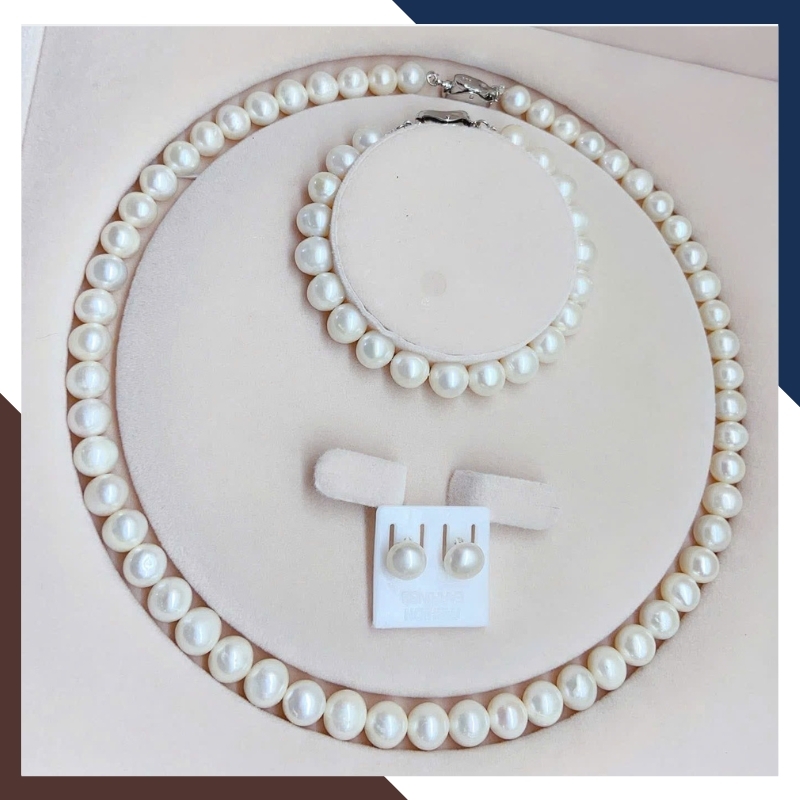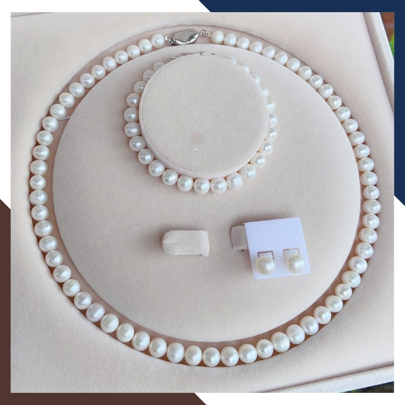 Bộ sản phẩm gồm: Vòng cổ ngọc trai, Vòng tay ngọc trai, Bông tai ngọc trai và Hộp đựng ngọc trai chuyên dụng.