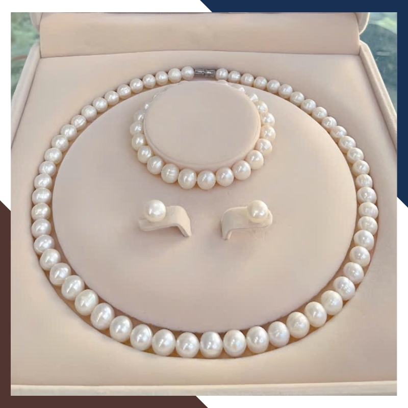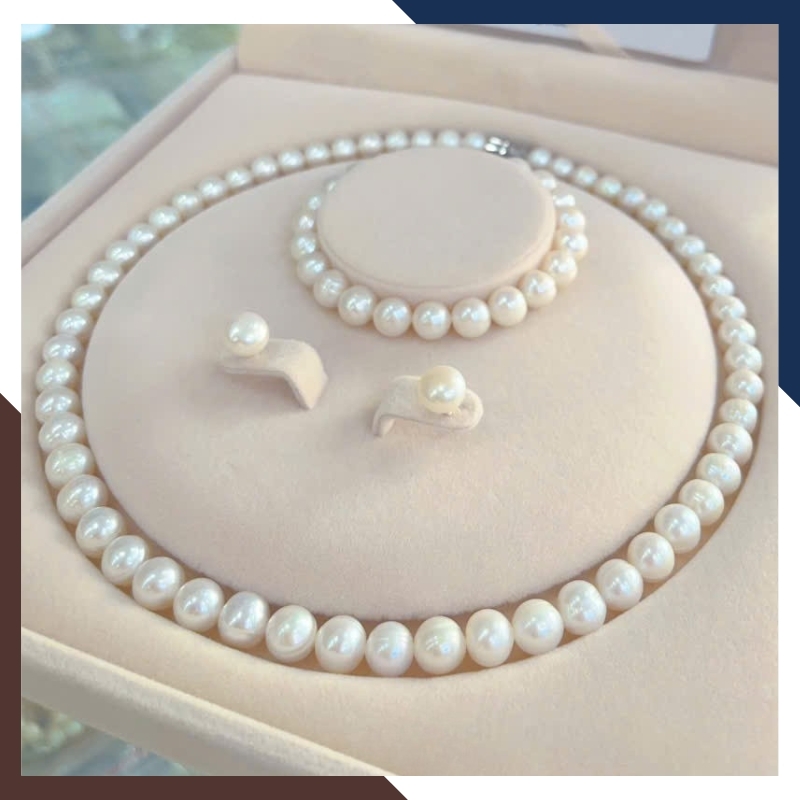 Với hạt ngọc trai 8–9mm, bộ trang sức này mang đến vẻ đẹp nhẹ nhàng, không phô trương nhưng vẫn đủ để thu hút mọi ánh nhìn.