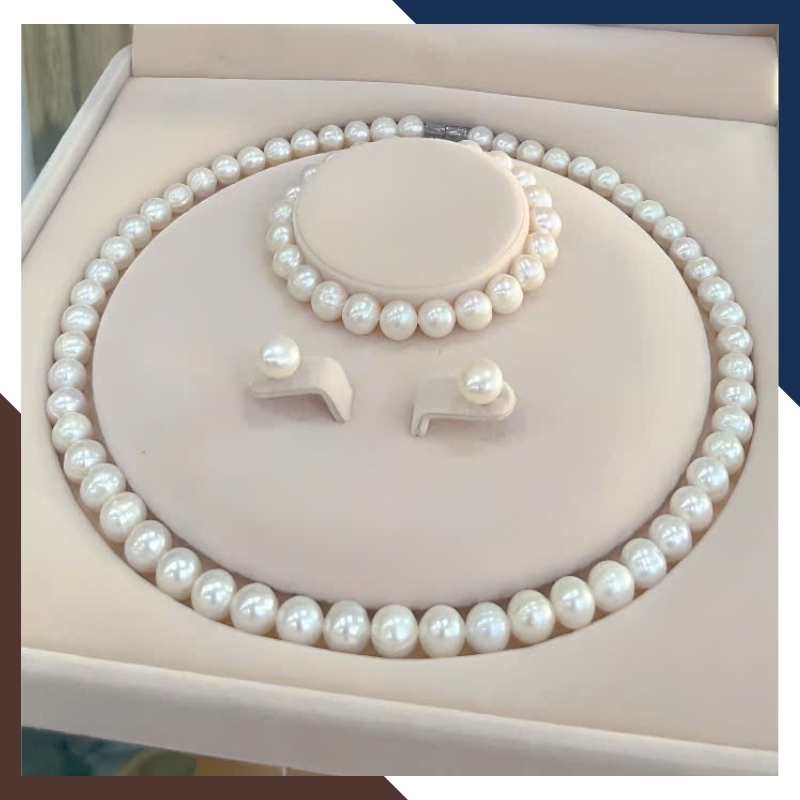 Vòng cổ, vòng tay, bông tai và hộp đựng ngọc trai chuyên dụng |