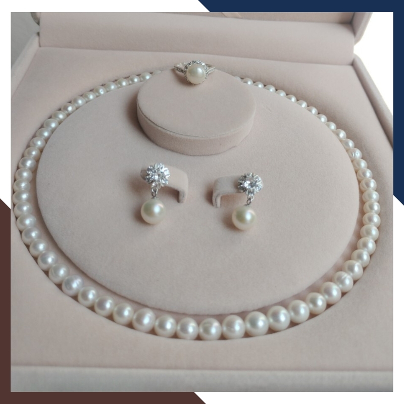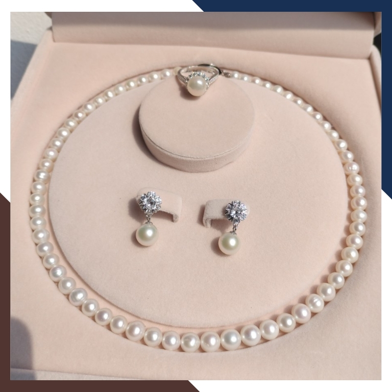Bộ sản phẩm gồm: Vòng cổ ngọc trai, nhẫn ngọc trai, bông tai ngọc trai và hộp đựng ngọc trai chuyên dụng