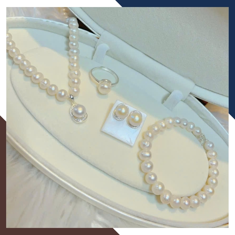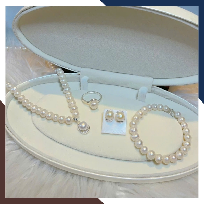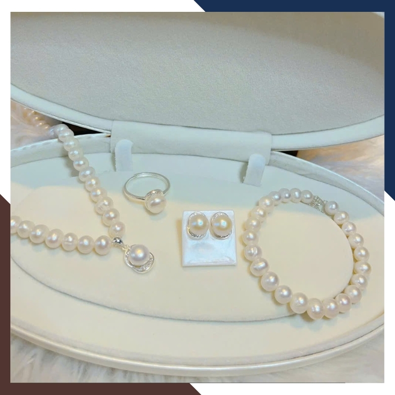 Bộ sản phẩm gồm: vòng cổ, vòng tay, bông tai, nhẫn và hộp đựng ngọc trai chuyên dụng