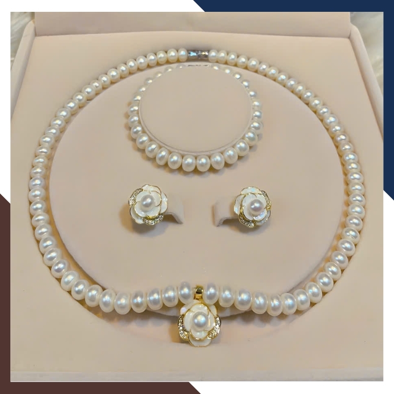 Bộ sản phẩm bao gồm vòng cổ, vòng tay, bông tai và hộp đựng ngọc trai chuyên dụng, được chế tác thủ công tỉ mỉ, mang đến sự hài hòa giữa nét cổ điển của ngọc trai trắng tự nhiên và sự lãng mạn, mềm mại của hoa hồng khảm trai xi vàng.
