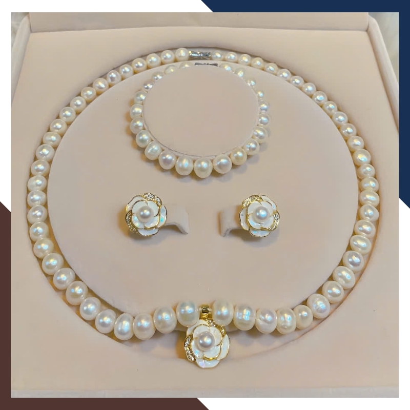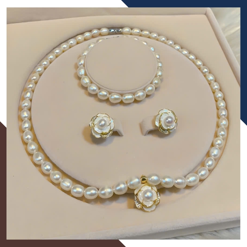 Bộ sản phẩm gồm: Vòng cổ, vòng tay, bông tai và hộp đựng ngọc trai chuyên dụng