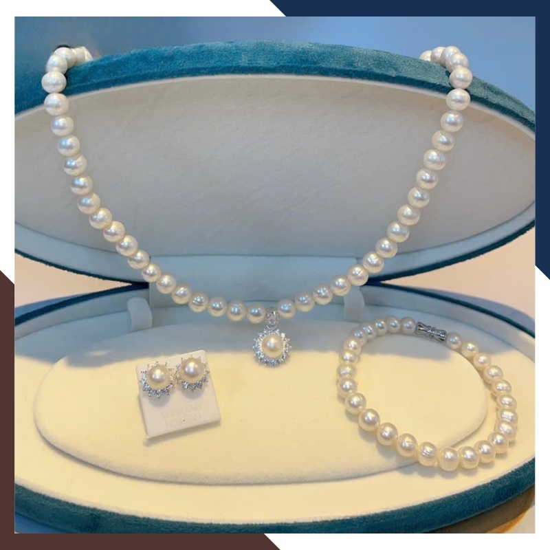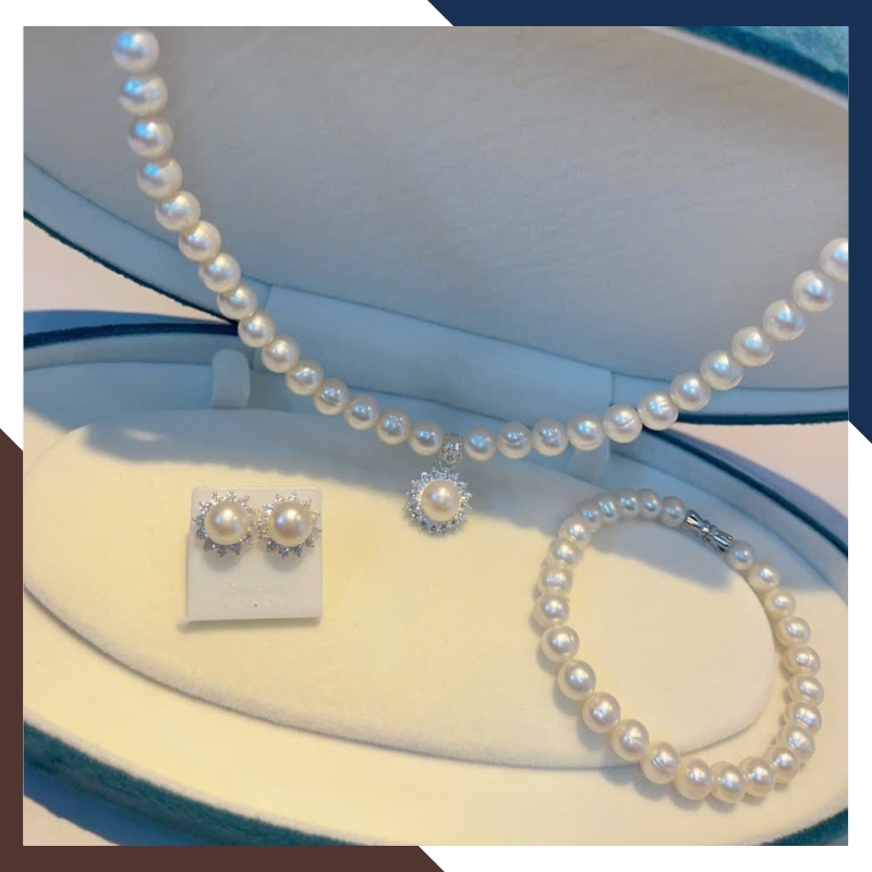 Bộ sản phẩm gồm: Vòng cổ, vòng tay, bông tai và hộp đựng ngọc trai chuyên dụng