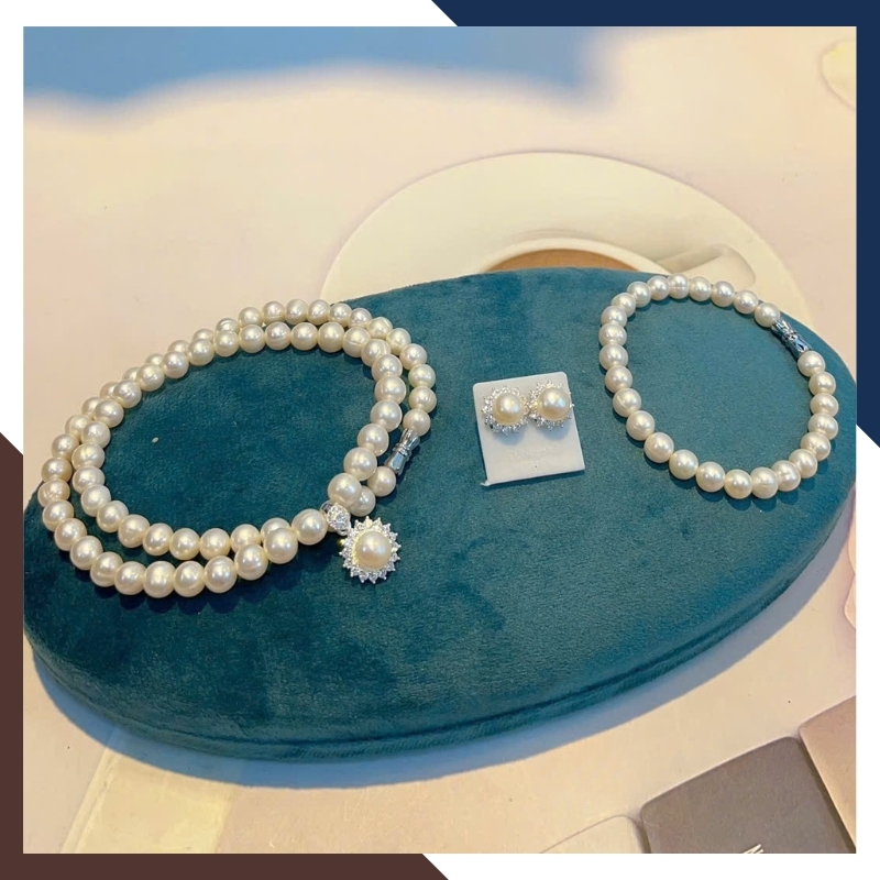 → Bộ sản phẩm gồm vòng cổ, vòng tay, bông tai và hộp đựng ngọc trai chuyên dụng đến từ thương hiệu Ngọc trai Anchi. -