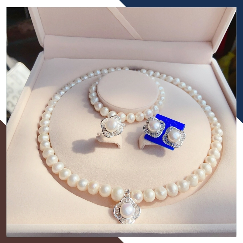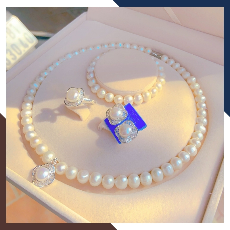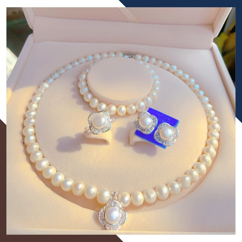 Bộ sản phẩm gồm: Vòng cổ, vòng tay, nhẫn, bông tai và hộp đựng ngọc trai chuyên dụng