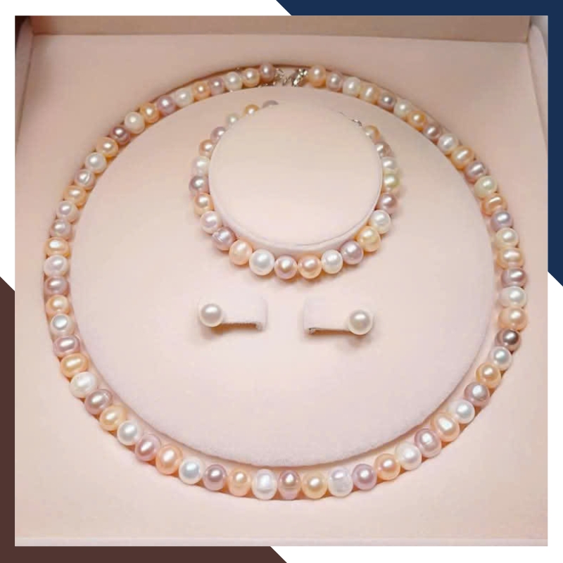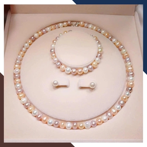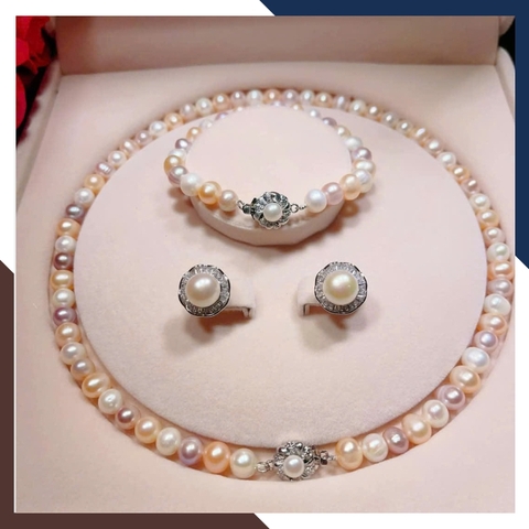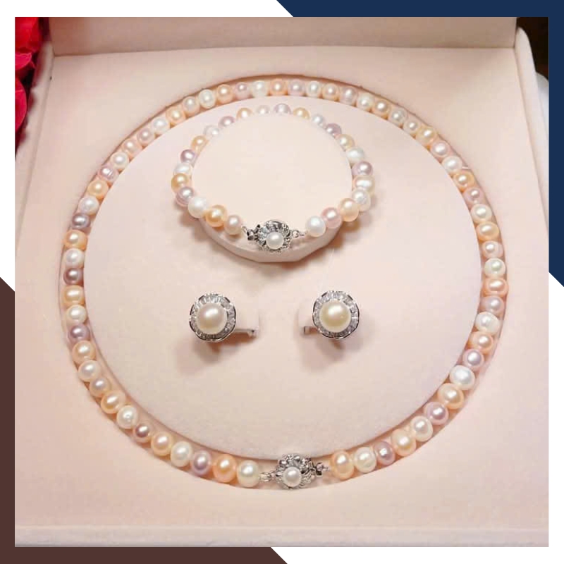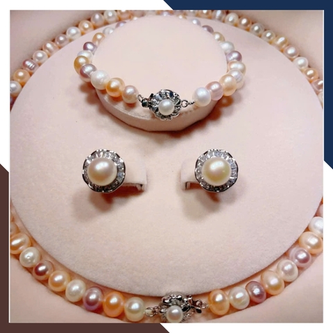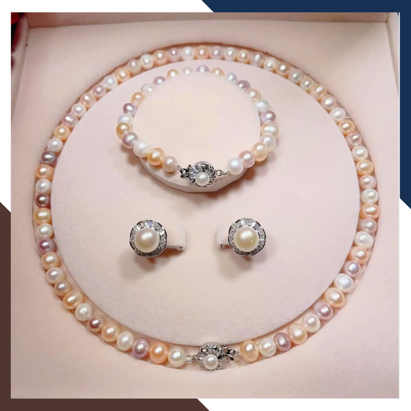 Bộ sản phẩm gồm: Vòng cổ, vòng tay, bông tai và hộp đựng ngọc trai chuyên dụng