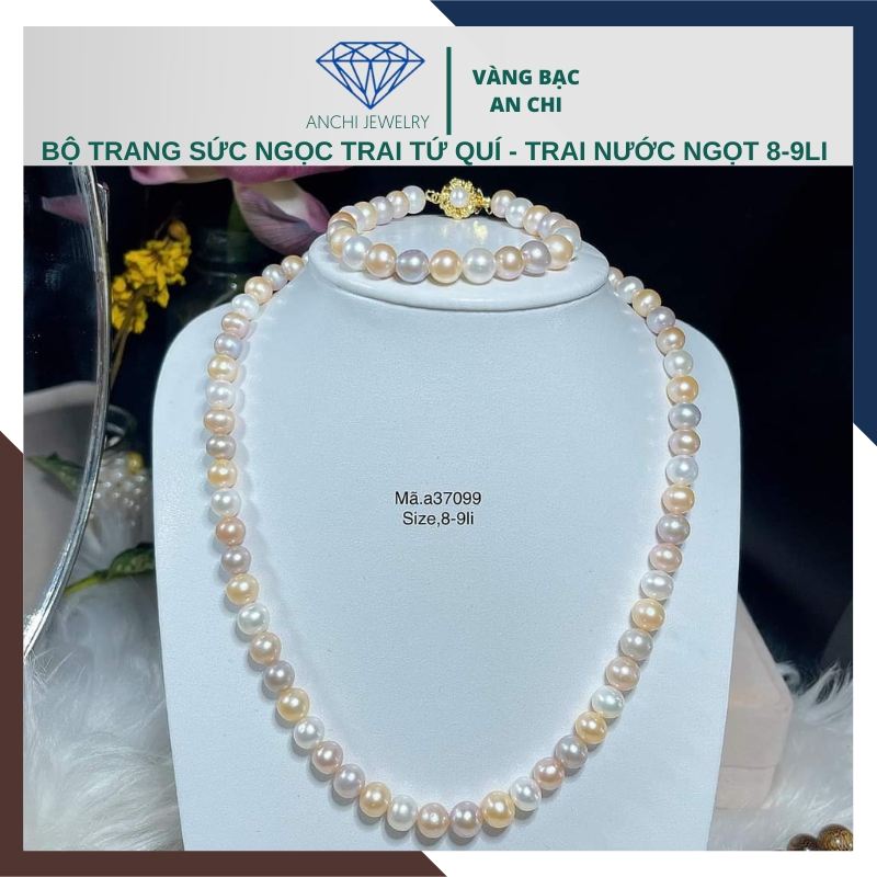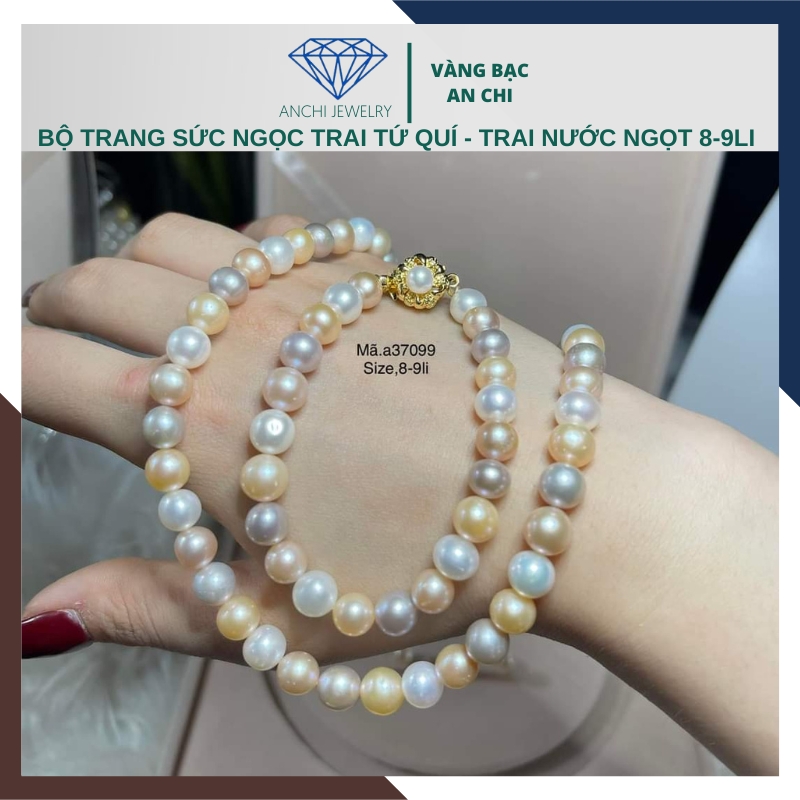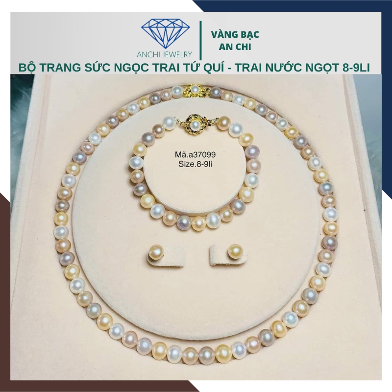Bộ trang sức ngọc trai tứ quý cao cấp mã BTSNT10 gồm vòng cổ, vòng tay và bông tai - được làm từ ngọc trai thật bề mặt bóng đẹp tự nhiên với sự kết hợp hài hoà vẻ đẹp của bốn màu ngọc trai trắng - hồng - tím và hồng cam với nhau tượng trưng cho sự tinh khiết - mềm mại - nữ tính và chung thủy của phụ nữ tạo điểm nhấn độc đáo và thu hút.