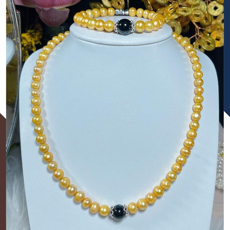 Bộ trang sức ngọc trai vàng ánh kim mix đá mã não tự nhiên mã C270T120 - là sự kết hợp hoàn hảo giữa màu vàng của ngọc trai với màu đỏ hoặc đen đá mã não tự nhiên, làm cho chiếc vòng trở lên sang trọng. Là món quà ý nghĩa để tặng cho người phụ nữ quan trọng nhất trong cuộc đời bạn. Chắc chắn rằng món quà này sẽ được trân trọng và ấn tượng lâu dài trong lòng mẹ bạn.