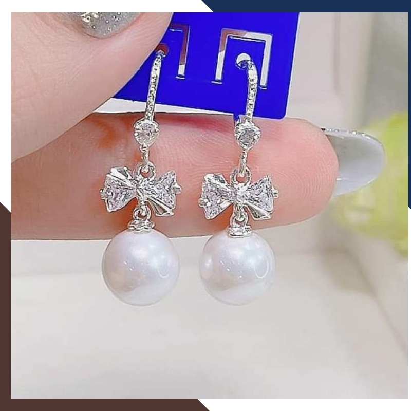 Kiểu dáng: Bông tai móc câu hình nơ đính ngọc trai kiểu tòn ten dáng dài