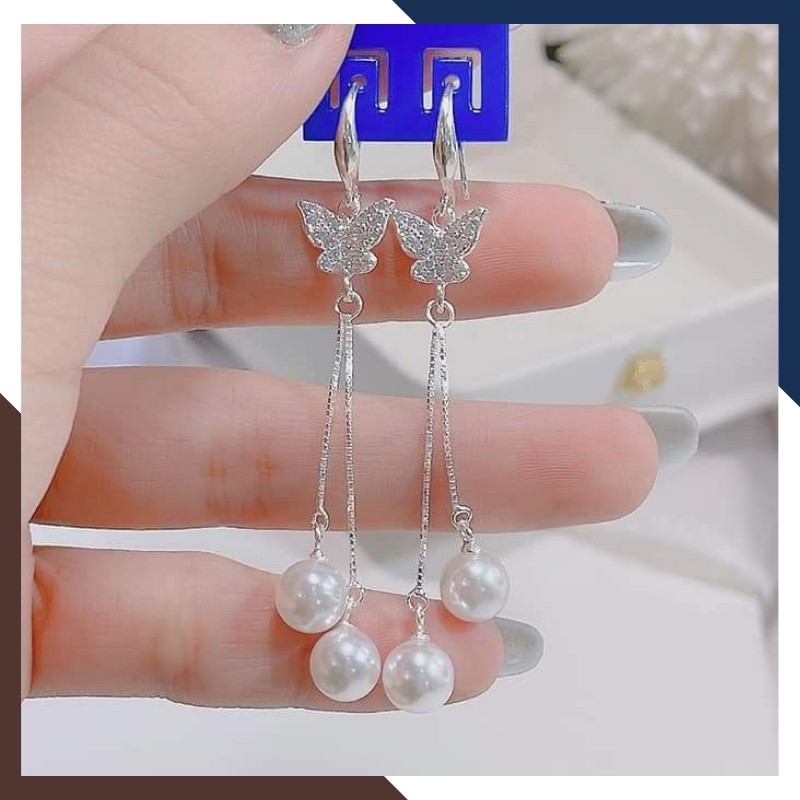 Kiểu dáng: Bông tai 2 dây bạc dài đính 2 viên ngọc trai, mặt hình con bướm xinh xắn