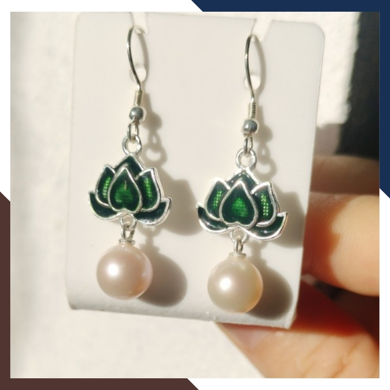 Bông tai ngọc trai móc câu dáng dài hình hoa sen đẹp cho nữ mã k90tt89 - là sự kết hợp hoàn hảo giữa chất liệu và kiểu dáng một cách tinh tế. Điểm nhấn đặc biệt của mẫu bông tai này chính là thiết kế kiểu móc câu đính viên ngọc trai tròn và ở giữa là bông hoa sen màu xanh nổi bật. Sản phẩm sử dụng chất liệu bạc ta nguyên chất S99 với đặc tính không gây kích ứng cho da và làm tăng thêm độ bền, vẻ sang trọng và quý phái cho sản phẩm, kết hợp cùng với viên ngọc trai thật nuôi nước ngọt tự nhiên size 8-9mm, được chọn lựa tỉ mỉ đảm bảo 2 viên ngọc trai tương đồng về màu sắc và kích thước, có bề mặt mịn màng bóng loáng, không vết sinh trưởng phản chiếu ánh ngũ sắc lấp lánh tự nhiên làm tăng thêm giá trị và vẻ đẹp quý phái cho bông tai.