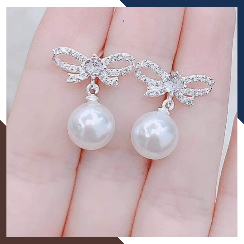 Kiểu dáng: Bông tai ngọc trai tòng teng lủng lẳng mặt hình chiếc nơ bằng bạc