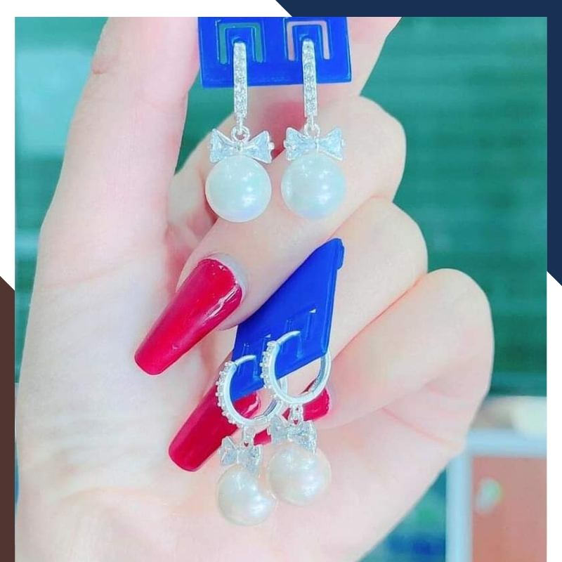 Kiểu dáng: Khuyên tai tròn đính ngọc trai kiểu tòn ten lủng lẳng, khung bằng bạc nạm đá