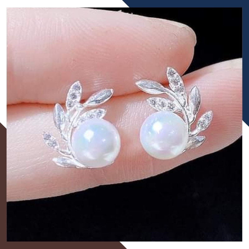 Kiểu dáng: Bông tai nụ ngọc trai thật khung bạc hình chiếc lá cong