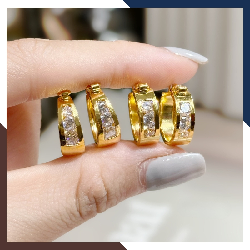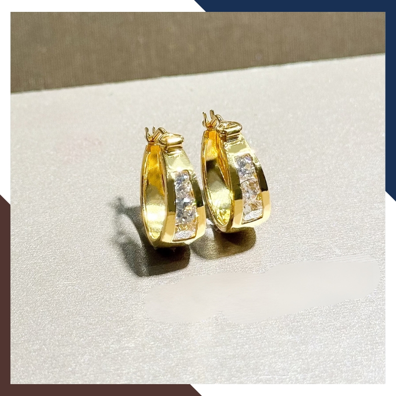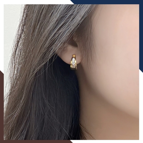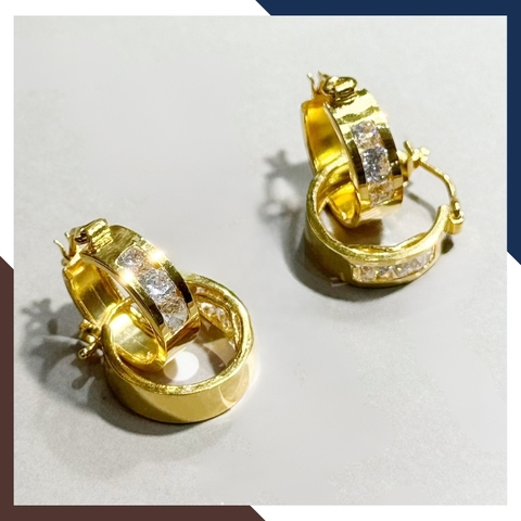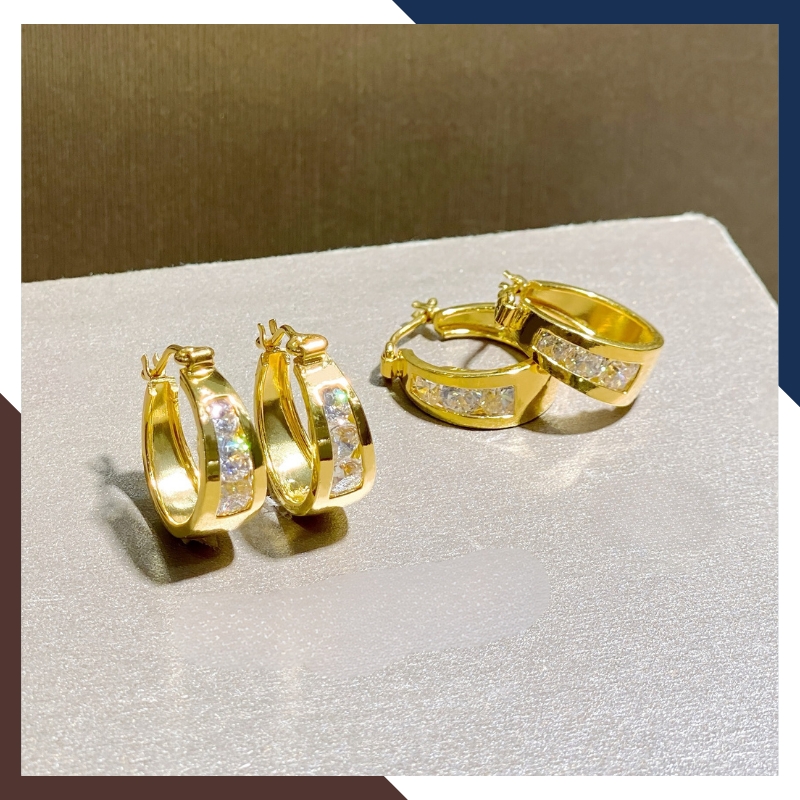 Kiểu dáng: Bông tai vàng tròn bản dày dặn đính đá kiểu chốt bấm chắc chắn, bông tai vàng trẻ trung
