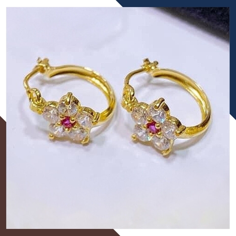 Kiểu dáng: Bông tai vàng em bé kiểu khuyên tròn đeo ôm sát tai hình bông hoa mai đính đá màu đỏ