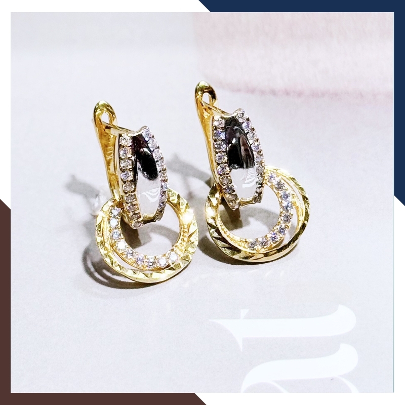 Bông tai vàng tây 10k hình đôi mắt treo vòng tròn kiểu tòn ten trẻ trung mới đẹp cho nữ, mẫu chốt bấm bật mã TL63, sử dụng nguyên liệu là vàng tây 10k đủ tuổi, đủ trọng lượng, kích thước - có giấy kiểm định tuổi vàng bằng máy đo quang phổ và giấy cam kết thu mua lại sản phẩm vàng cũ