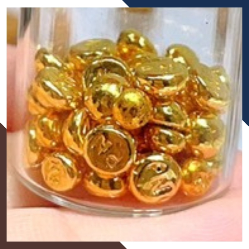 Hạt đậu vàng được chế tác từ vàng ta 24k 9999 nguyên chất, có trọng lượng khoảng từ 1 đến 2 phân, có hình dáng tròn dẹp giống hạt đậu tương - mang ý nghĩa vượng phát, tích tài sinh lộc, nối dài phú quý.