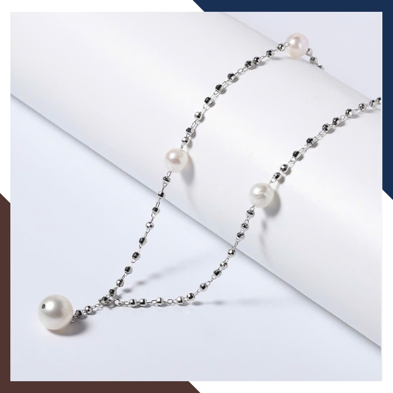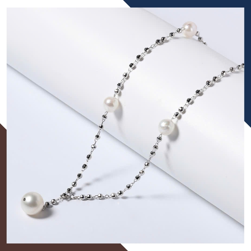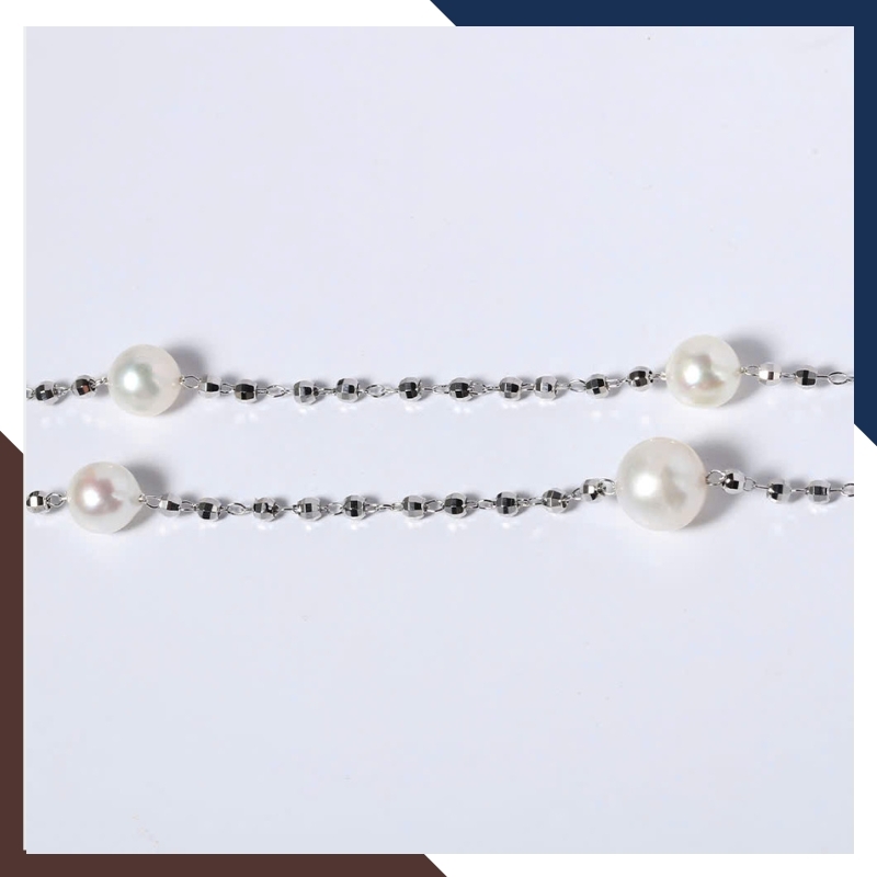 Mỗi viên ngọc trai nước ngọt thật, với kích thước 7–8mm, được lựa chọn tỉ mỉ để đảm bảo độ tròn, bóng mịn và ánh xà cừ tự nhiên. Xen kẽ giữa những viên ngọc ấy là chuỗi bạc 925 xi bạch kim – sáng bóng, tinh tế, bền bỉ và sang trọng.