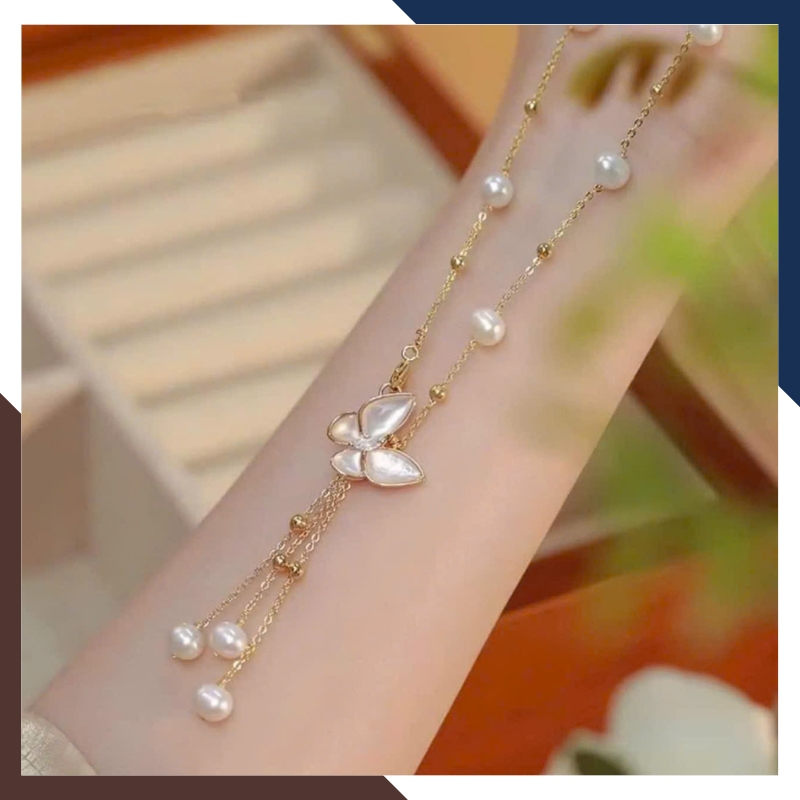 Kiểu dáng: Dây chuyền bạc ngọc trai kiểu cách hạt đính cánh bướm bằng xà cừ ( cỏ con trai ).
