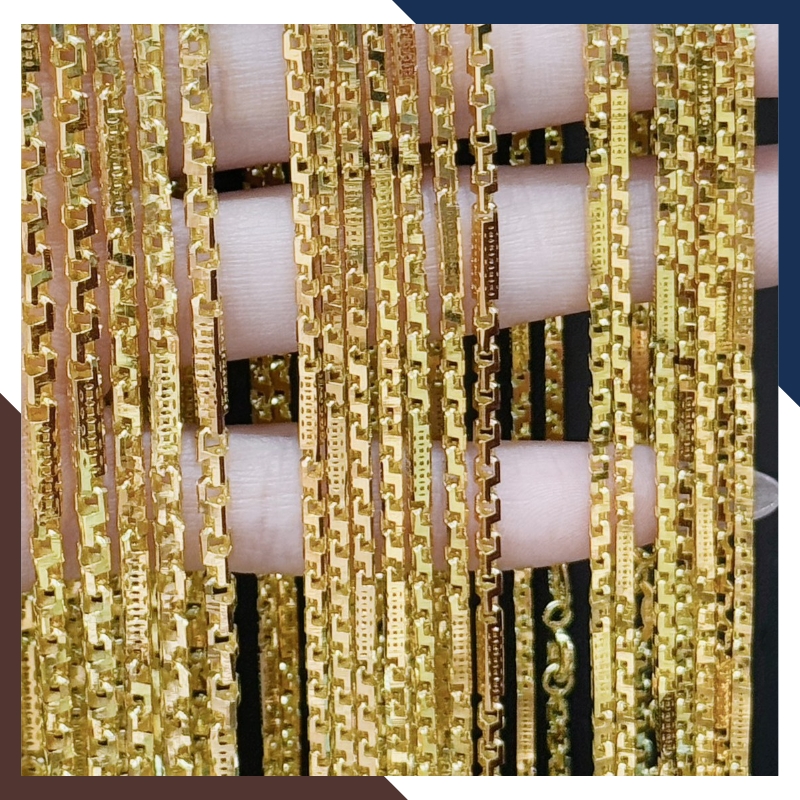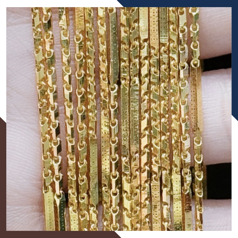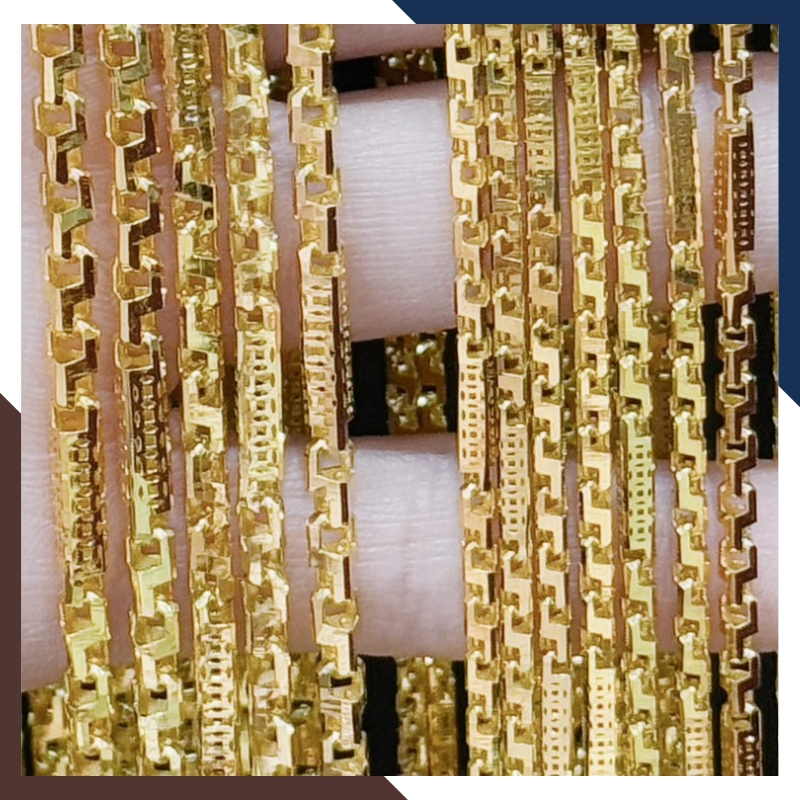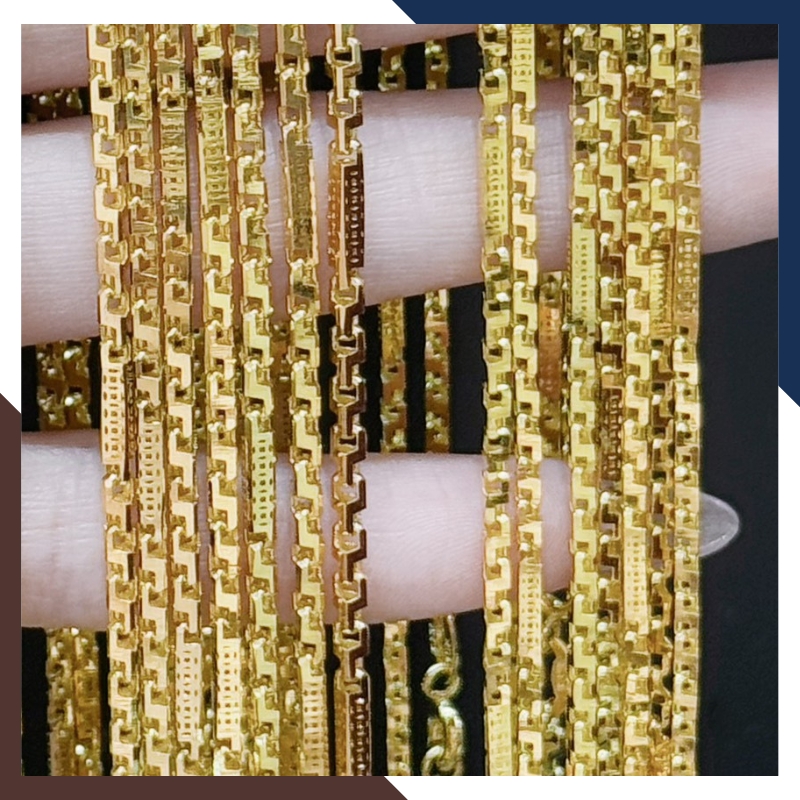 Kiểu dáng: Dây chuyền khúc chữ cong khúc ống trúc vuông khắc họa tiết kim tiền bằng vàng tây 10k ( mẫu dây trơn không mặt )