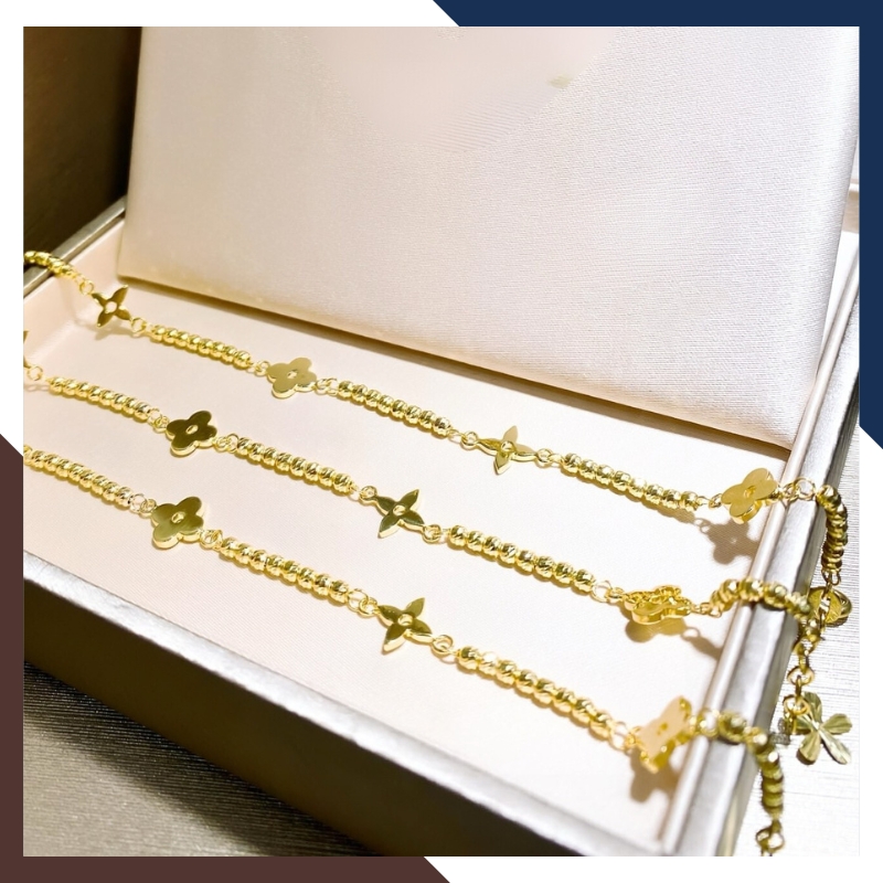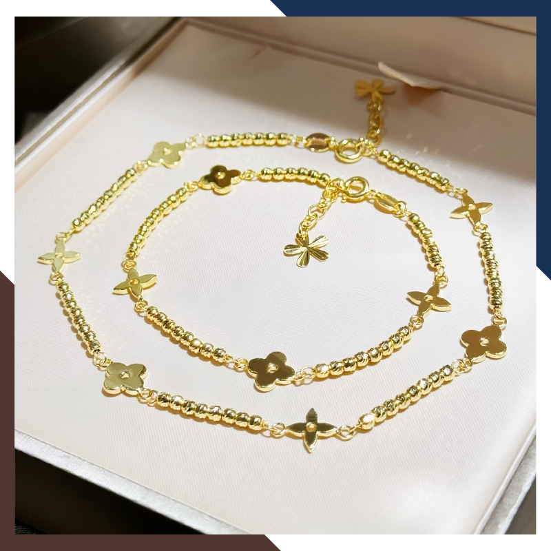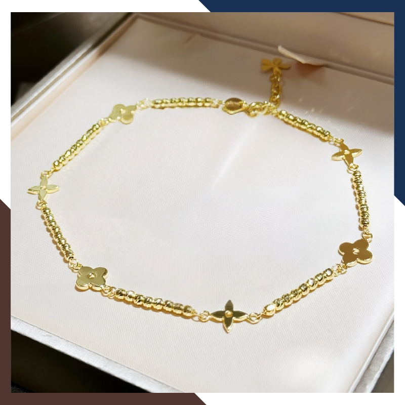 Kiểu dáng: Lắc chân bi vàng tây 10k phối hoa 4 cánh ( cỏ 4 lá ) có tua chờ tự chỉnh size