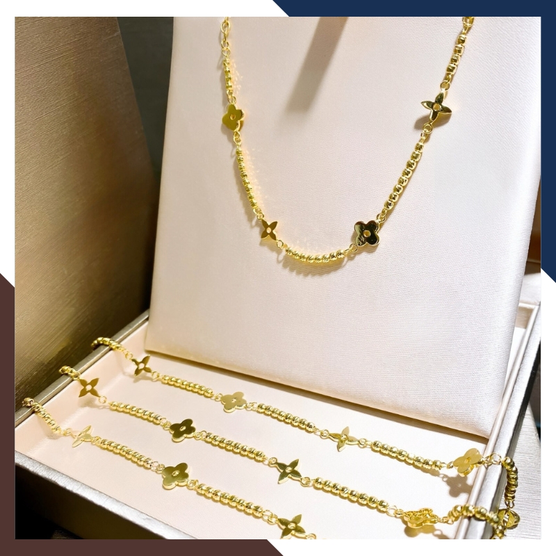 Lắc chân bi vàng 10k phối hoa 4 cánh đẹp cho nữ mã TL150, được gia công trực tiếp tại xưởng không qua khâu trung gian đảm bảo giá thành cạnh tranh