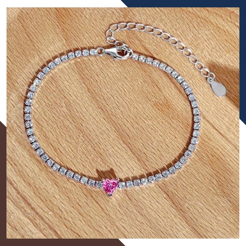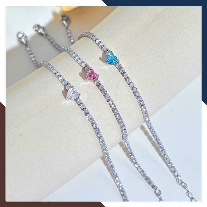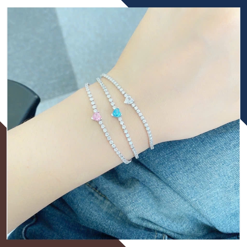 Kiểu dáng: Lắc tay bạc đính đá CZ phối mặt hình trái tim đính đá màu xanh, hồng, trắng, đỏ - Sang Trọng & Nổi Bật, Thu Hút Mọi Ánh Nhìn
