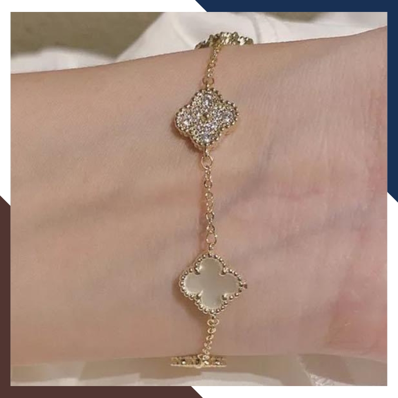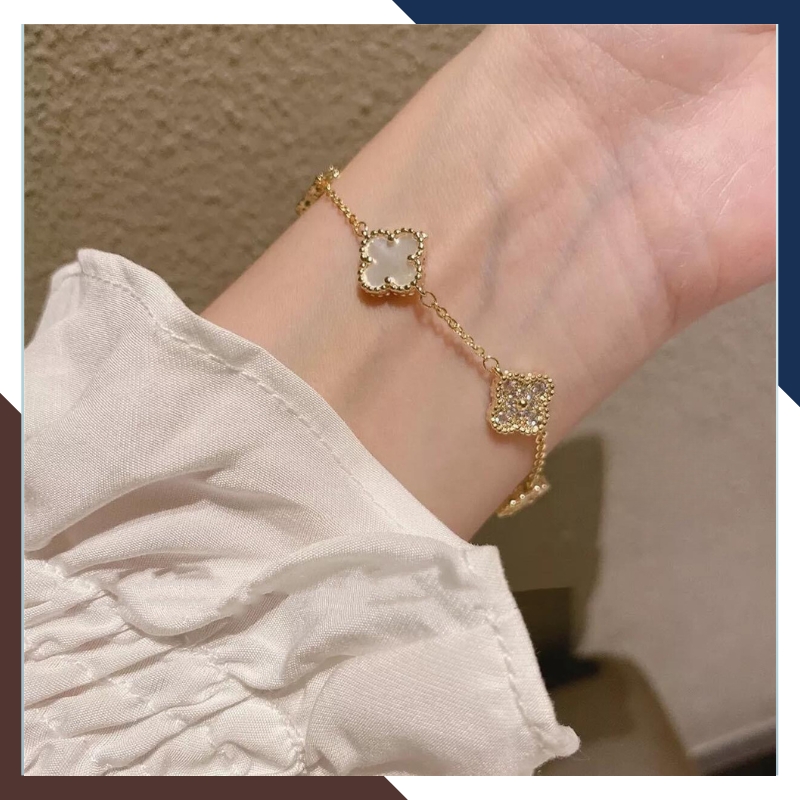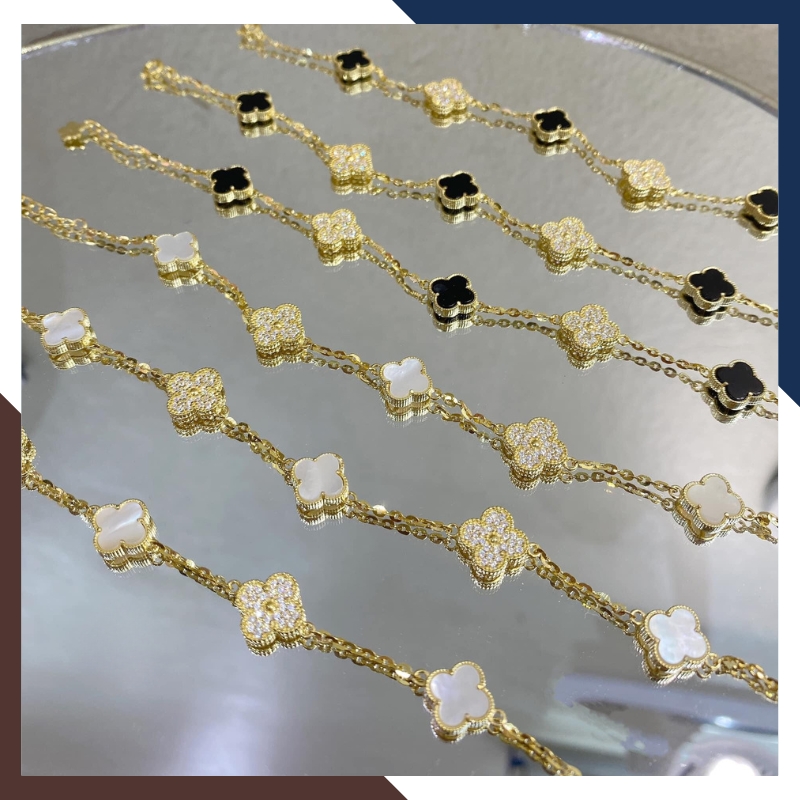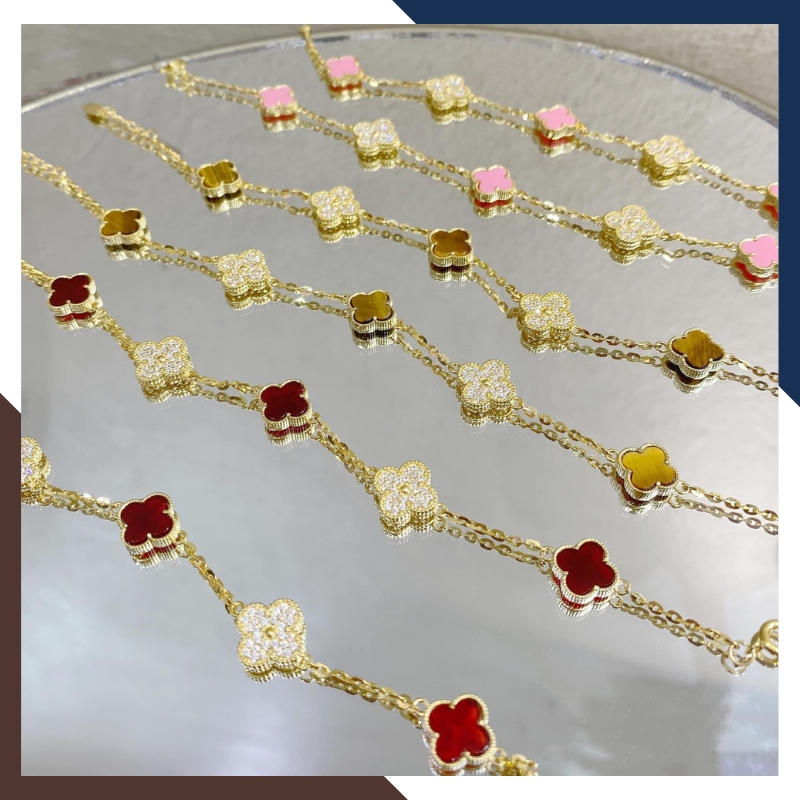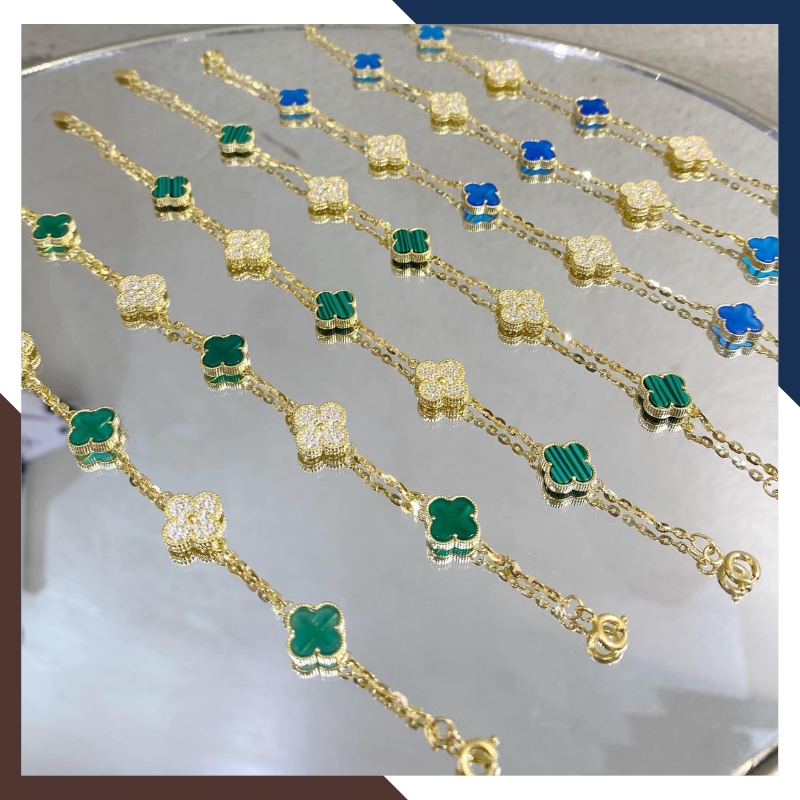 Kiểu dáng: Lắc tay cỏ 4 lá bằng vàng tây 10k đính đá - có 9 màu đá để khách hàng lựa chọn đỏ, đen, trắng, xanh, hồng, vàng