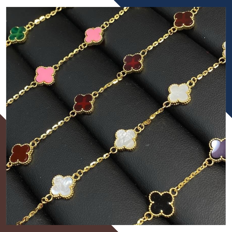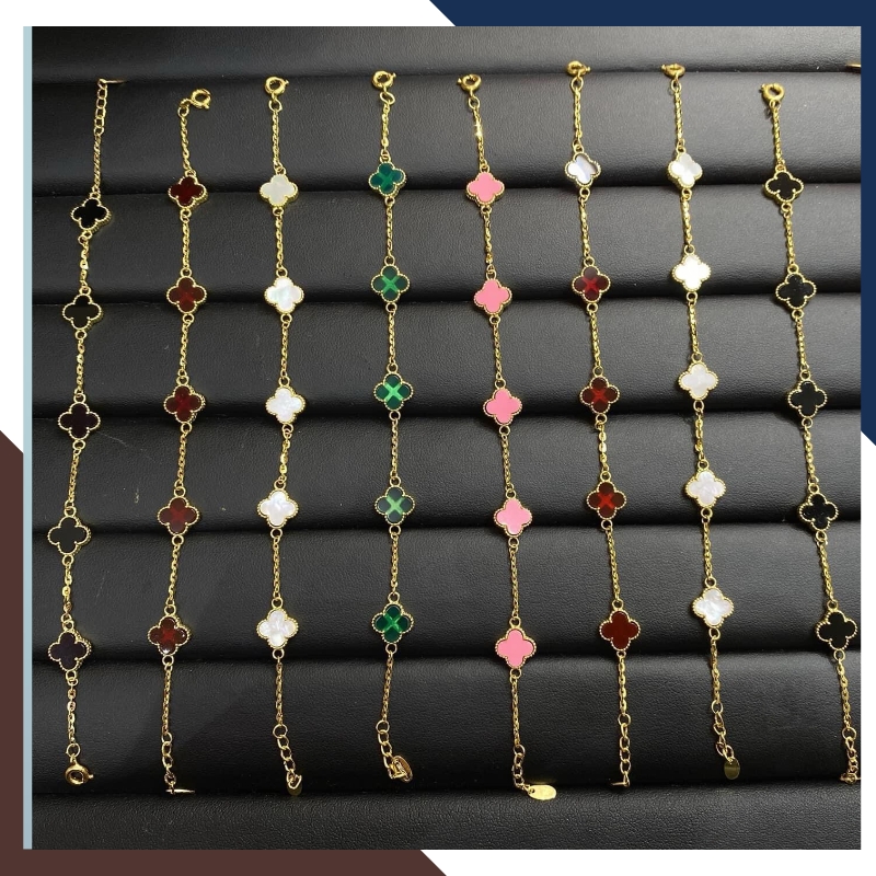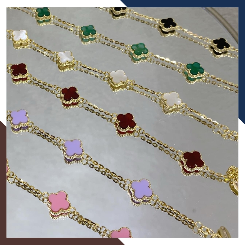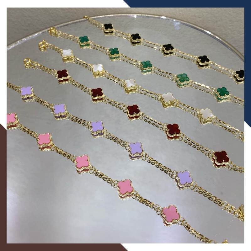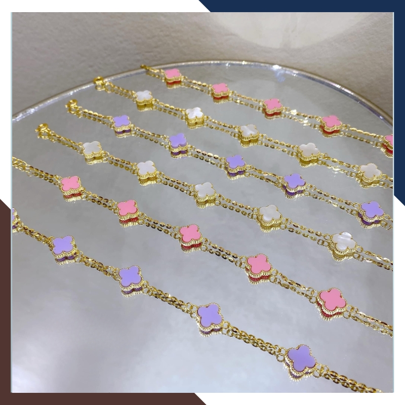 Kiểu dáng: Lắc tay cỏ 4 lá bằng vàng tây 10k đính đá đỏ, đen, trắng, xanh, hồng, tím