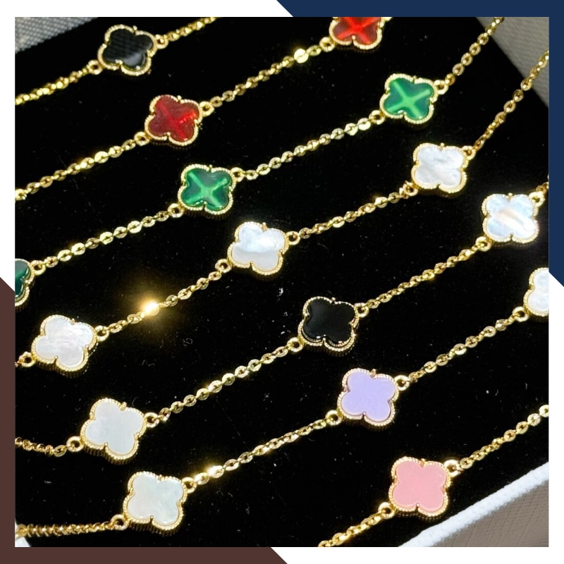 Kiểu dáng: Lắc tay cỏ 4 lá vàng tây 10k đính đá màu đỏ, đen, trắng, xanh, vàng, hồng, tím