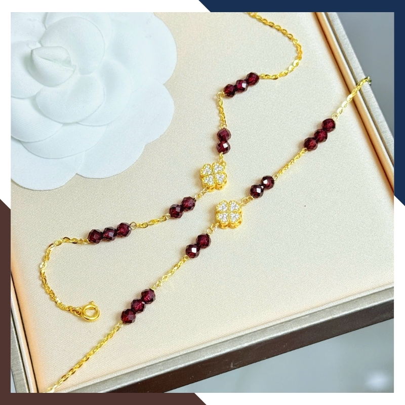 Điểm nhấn chính là charm cỏ 4 lá – biểu tượng quốc tế của sự may mắn, thịnh vượng và cơ hội tốt đẹp. Khi kết hợp với màu đỏ của Garnet, chiếc lắc như một “lá bùa hộ mệnh” nhỏ xinh luôn đồng hành bên bạn.