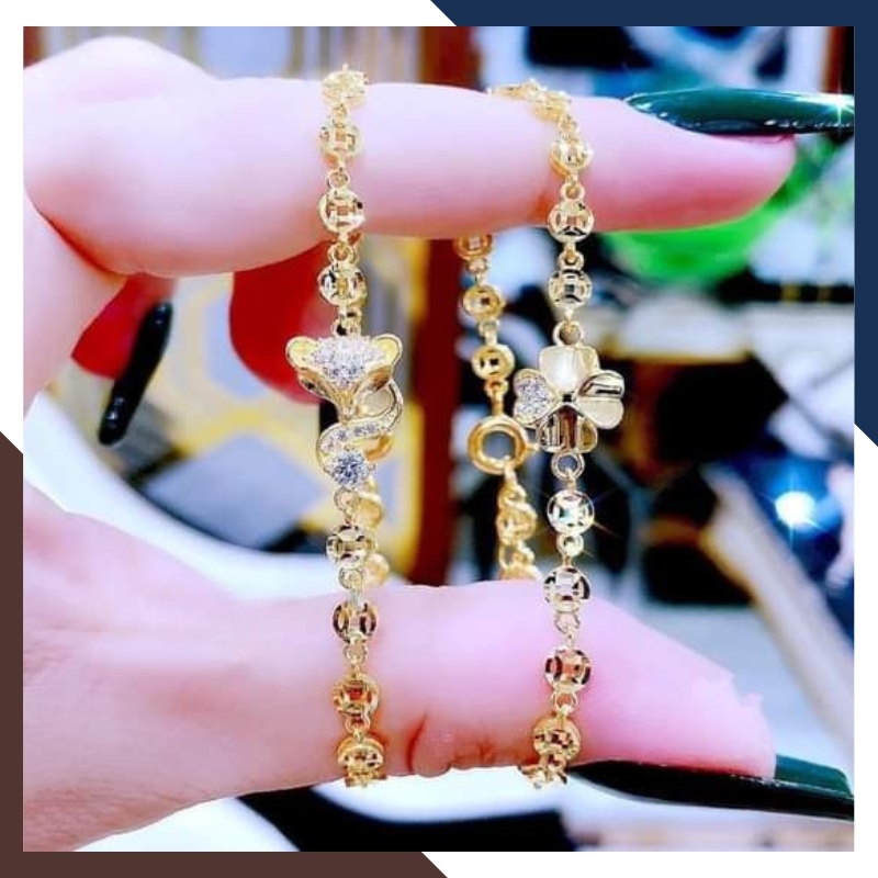 Lắc tay sử dụng vàng tây 10K, bền chắc, sáng bóng và phù hợp đeo hàng ngày.