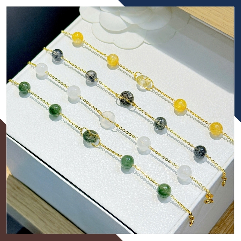 Thiết kế thanh mảnh, sang trọng, điểm nhấn bằng 5 hạt thạch anh tóc tự nhiên – đá quý được nhiều người tin tưởng về năng lượng tích cực.