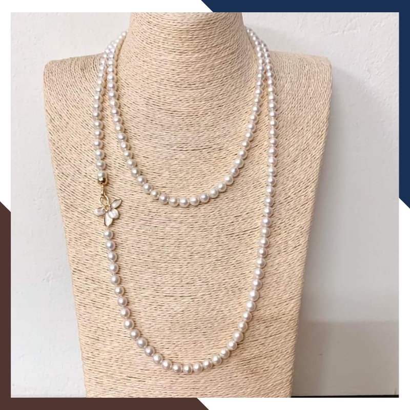 Vòng cổ ngọc trai dài với chiều dài từ 60cm đến 180cm, không chỉ làm tăng thêm vẻ đẹp bên ngoài mà còn thể hiện gu thẩm mỹ tinh tường và đẳng cấp của mẹ. Đặc biệt, với thiết kế dài, vòng cổ ngọc trai còn tạo hiệu ứng thon gọn cho khuôn mặt và cổ, giúp người đeo trông duyên dáng và thanh thoát hơn.