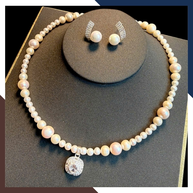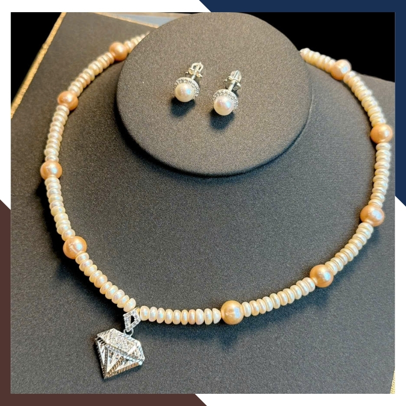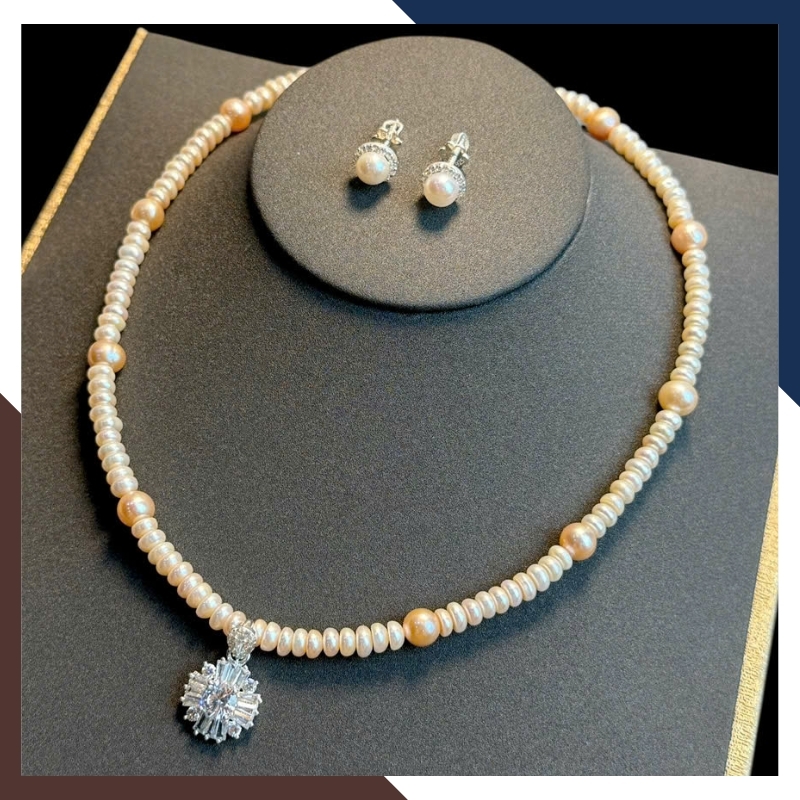 Cấu trúc mỗi set: Vòng cổ ngọc trai gắn mặt bạc 925 + bông tai bạc đính ngọc trai