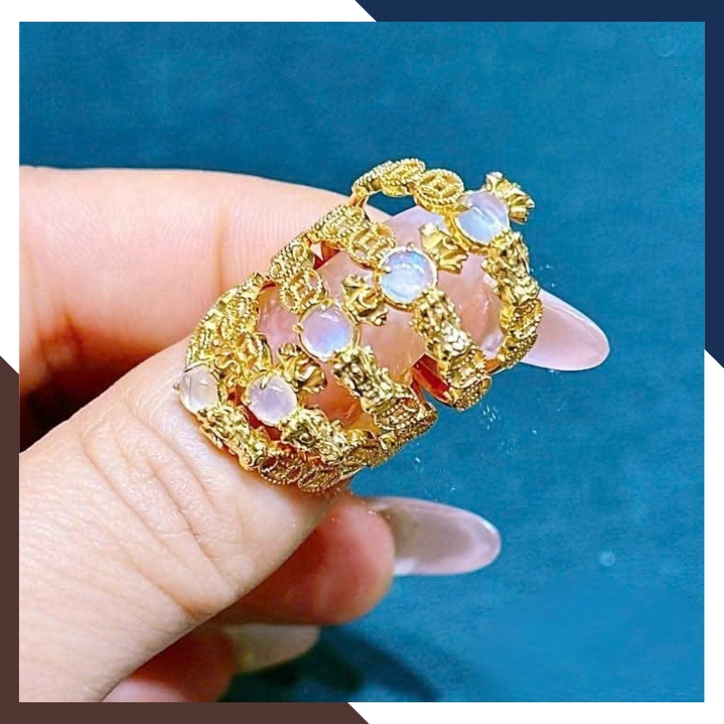 Sự kết hợp giữa nhẫn vàng đính đá Moonstone và hình tượng kim tiền – Tỳ Hưu giúp sản phẩm vừa thu hút tài lộc, vừa mang lại cảm giác an yên, ổn định.