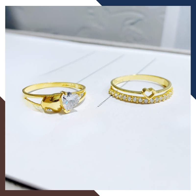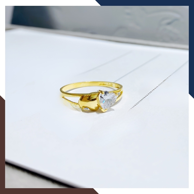 Mẫu 2: Nhẫn gắn đá trái tim cao, viên đá chủ trong suốt được mài giác chuẩn, nổi bật trên nền vàng tây 10k. Thân nhẫn ôm gọn viên đá, vừa chắc chắn vừa tinh xảo.