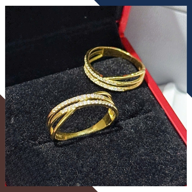 Mẫu nhẫn đan chéo được thiết kế từ ba dải nhẫn mảnh, đan xen vào nhau một cách hài hòa. Trên bề mặt, những viên đá nhỏ được sắp xếp đều nhau, tạo hiệu ứng ánh sáng lung linh khi di chuyển bàn tay.