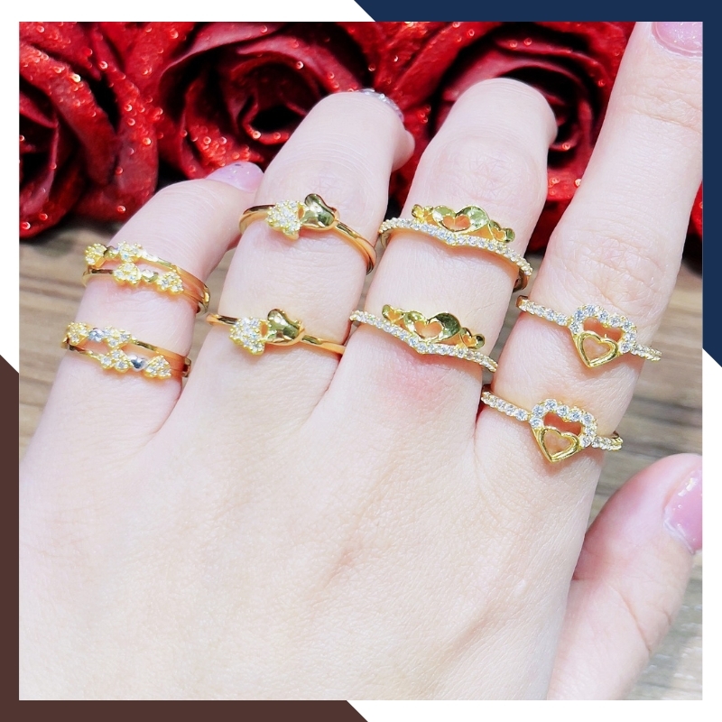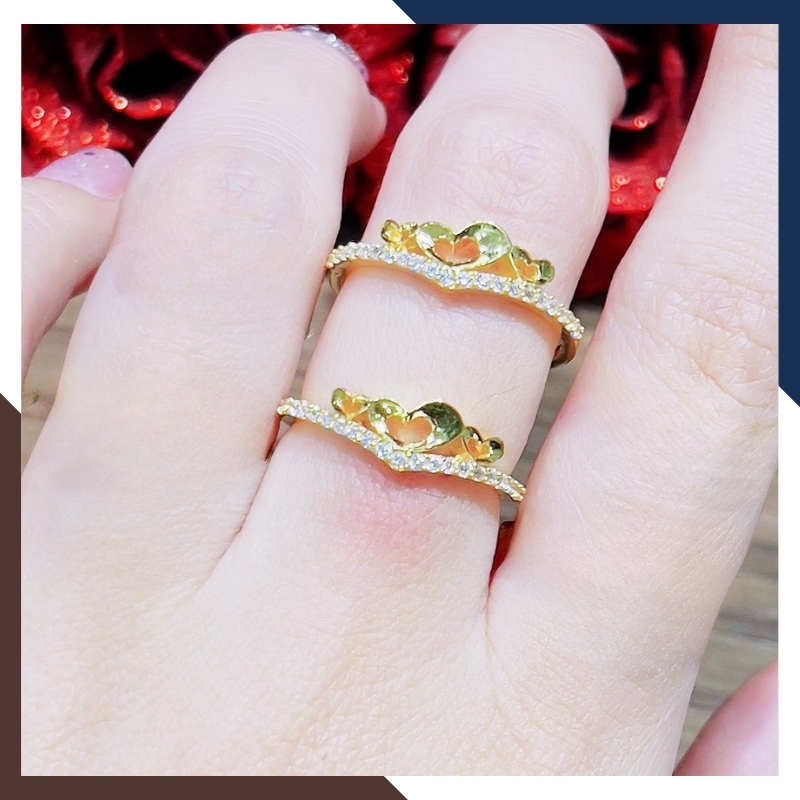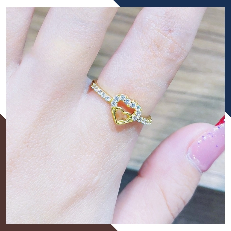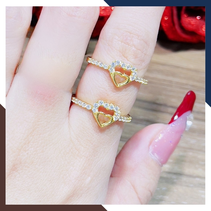 Mẫu 1: Trái tim kép lấp lánh: Thiết kế độc đáo với hai lớp trái tim lồng vào nhau: một trái tim vàng trơn nằm gọn trong khung trái tim đính đá CZ sáng lấp lánh. Thân nhẫn thanh mảnh, đính đá tinh xảo, tạo cảm giác vừa nữ tính vừa sang trọng.