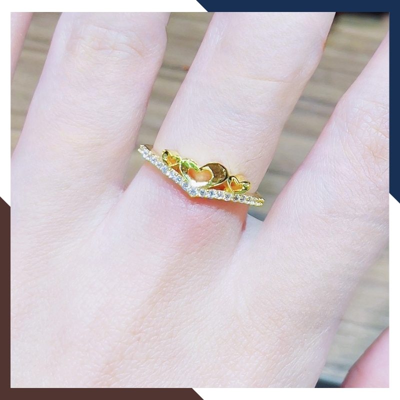 Mẫu 2: Vương miện mini trái tim: Nhẫn lấy cảm hứng từ hình dáng vương miện công chúa, được tạo nên bởi các họa tiết trái tim nối tiếp. Ở trung tâm là một trái tim vàng nổi bật, bao quanh là dải đá CZ trắng sáng, mang lại vẻ ngọt ngào và đầy nữ tính.
